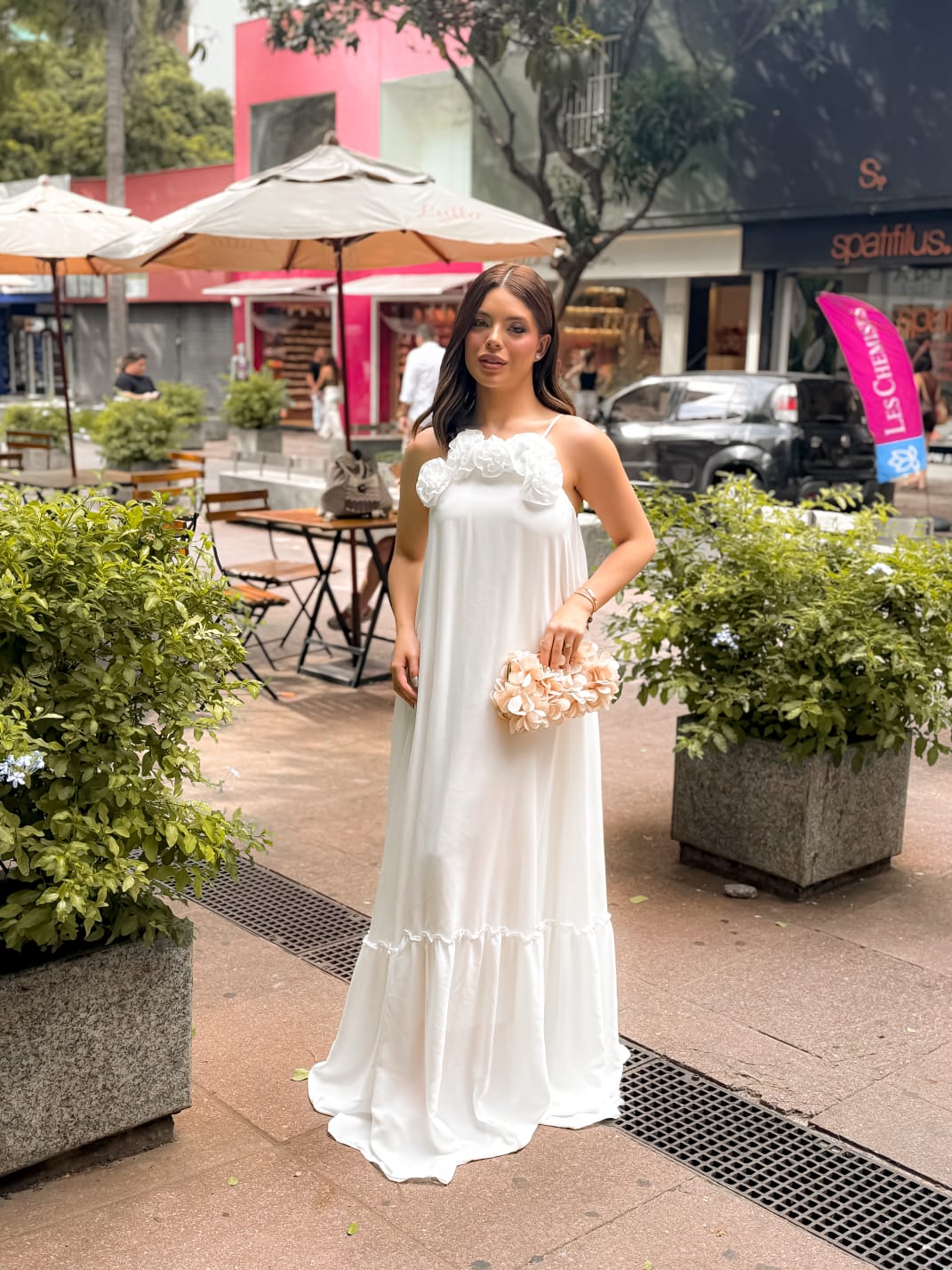VESTIDO CHIFFON FRENTE ÚNICA COM DETALHE FLORES ACIMA DO BUSTO SAIA COM CORTE BRANCO