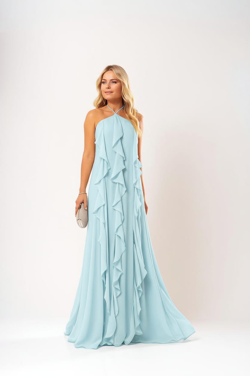 VESTIDO CHIFFON BABADO FRENTE ÚNICA MARIBEL AZUL SERENITY