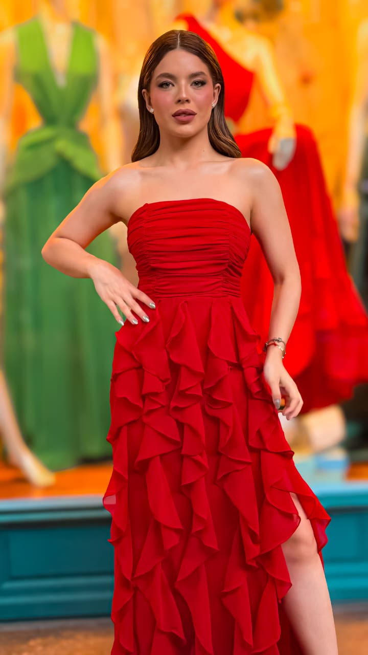 VESTIDO CHIFFON TOMARA QUE CAIA PARTE DE CIMA DRAPEADA E SAIA COM BABADOS VERTICAIS VERMELHO