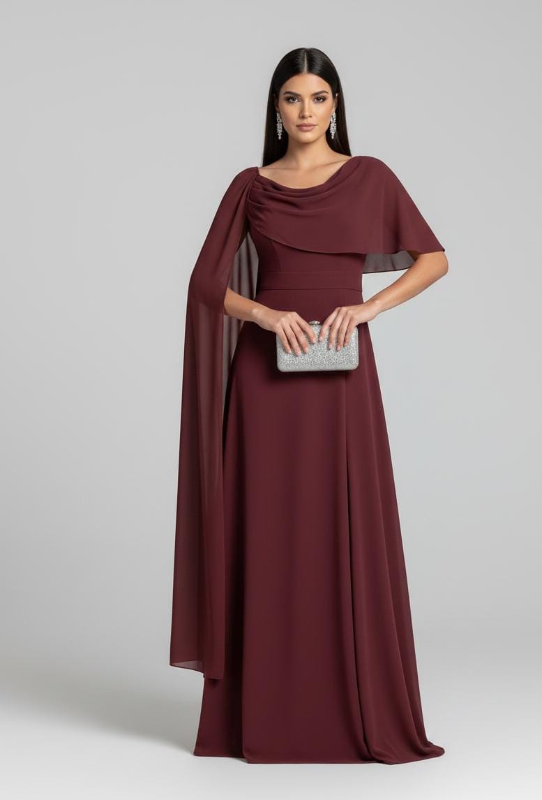 VESTIDO CREPE MANGA CAPA ACINTURADO SAIA LISA MARSALA