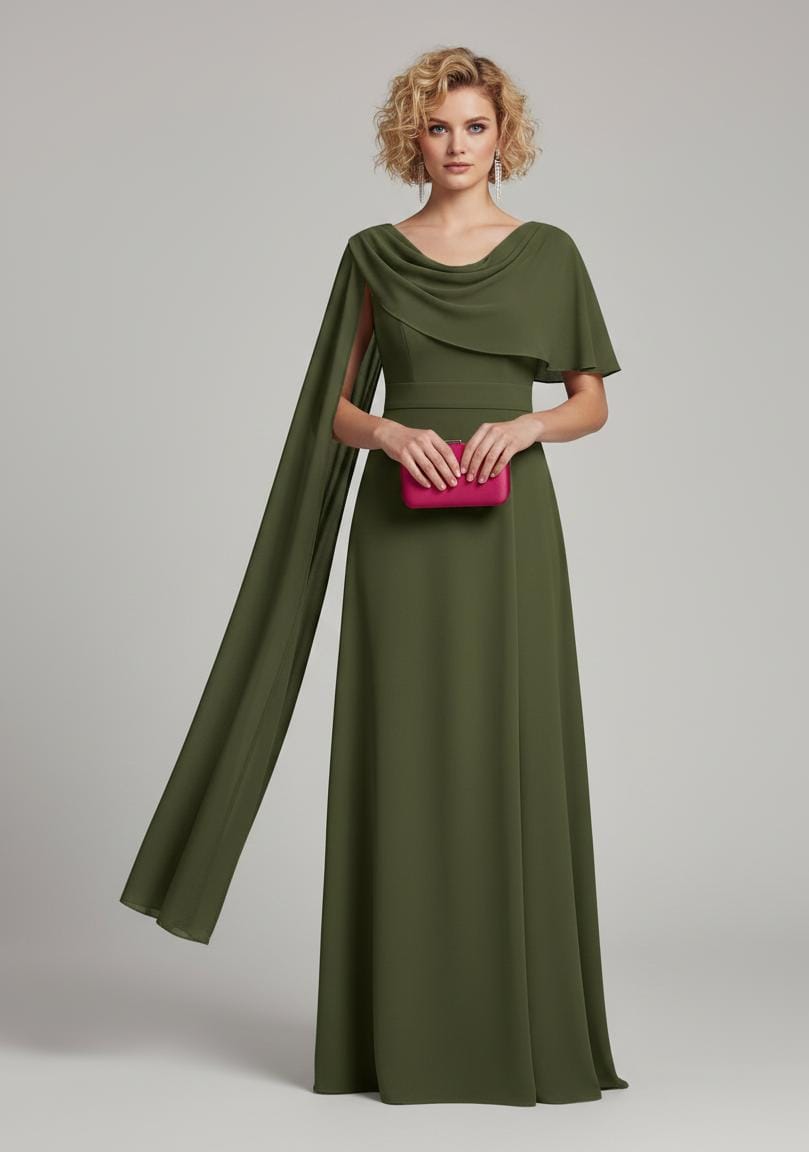 VESTIDO CREPE MANGA CAPA ACINTURADO SAIA LISA VERDE OLIVA