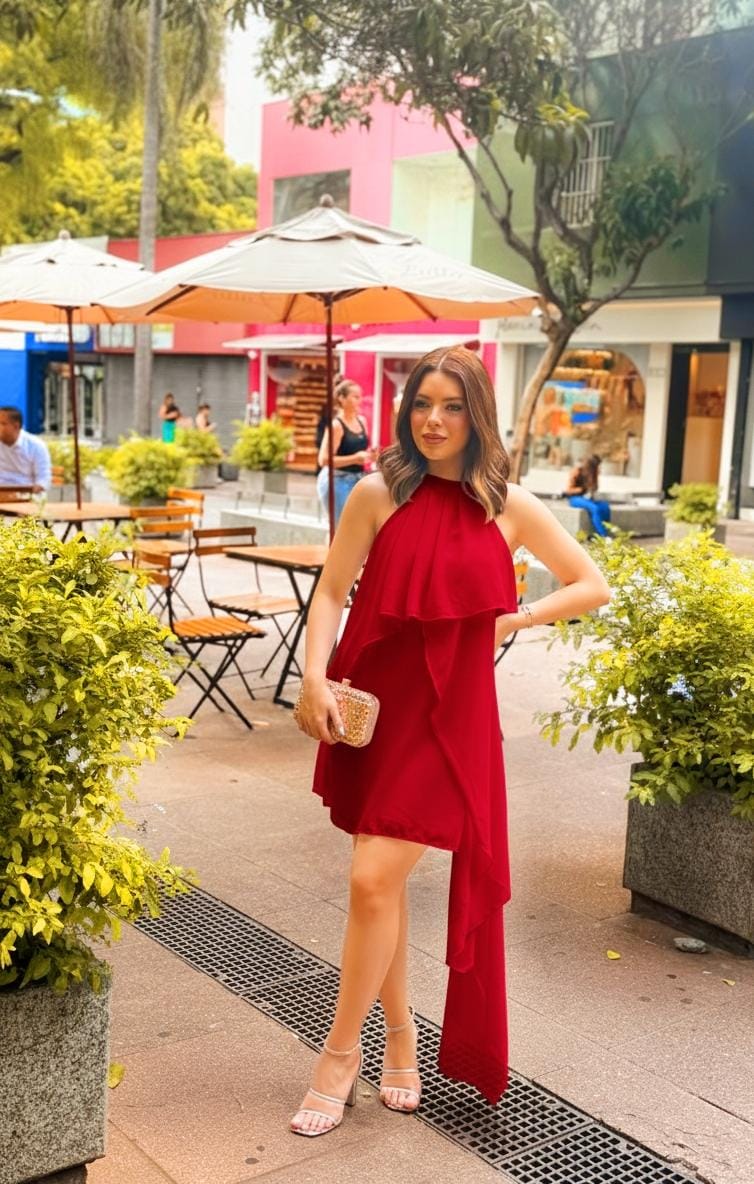 VESTIDO CURTO FRENTE ÚNICA COM CAMADA SOBRE BUSTO E NA LATERAL VERMELHO