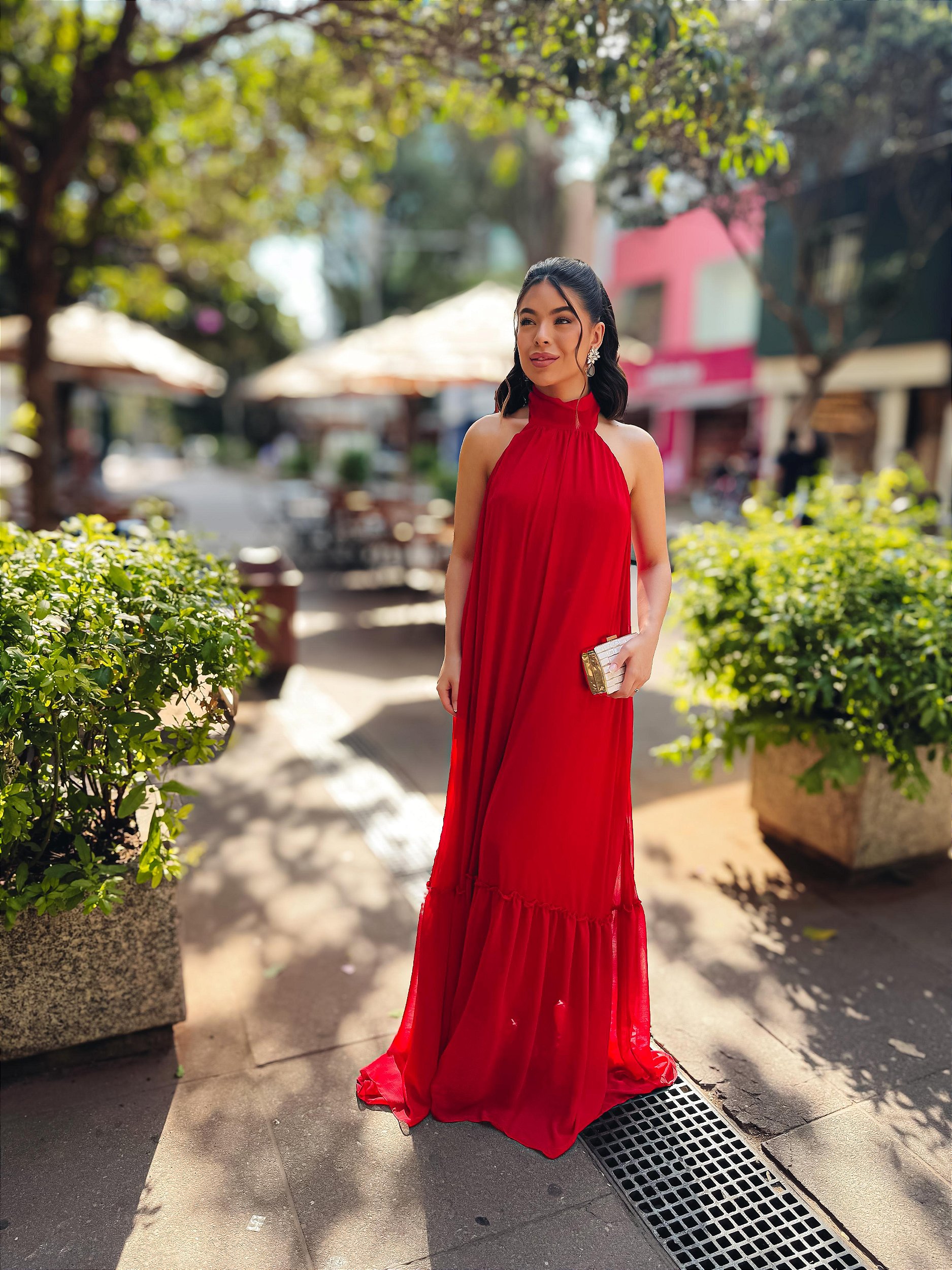 VESTIDO LONGO CHIFFON FRENTE ÚNICA SAIA CAMADA VERMELHO