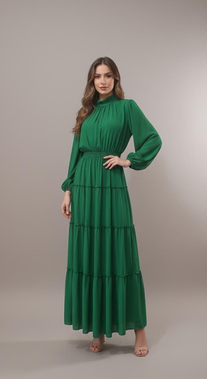 VESTIDO LONGO CHIFFON GOLA ALTA COM MANGA SAIA EM CAMADAS VERDE ESMERALDA