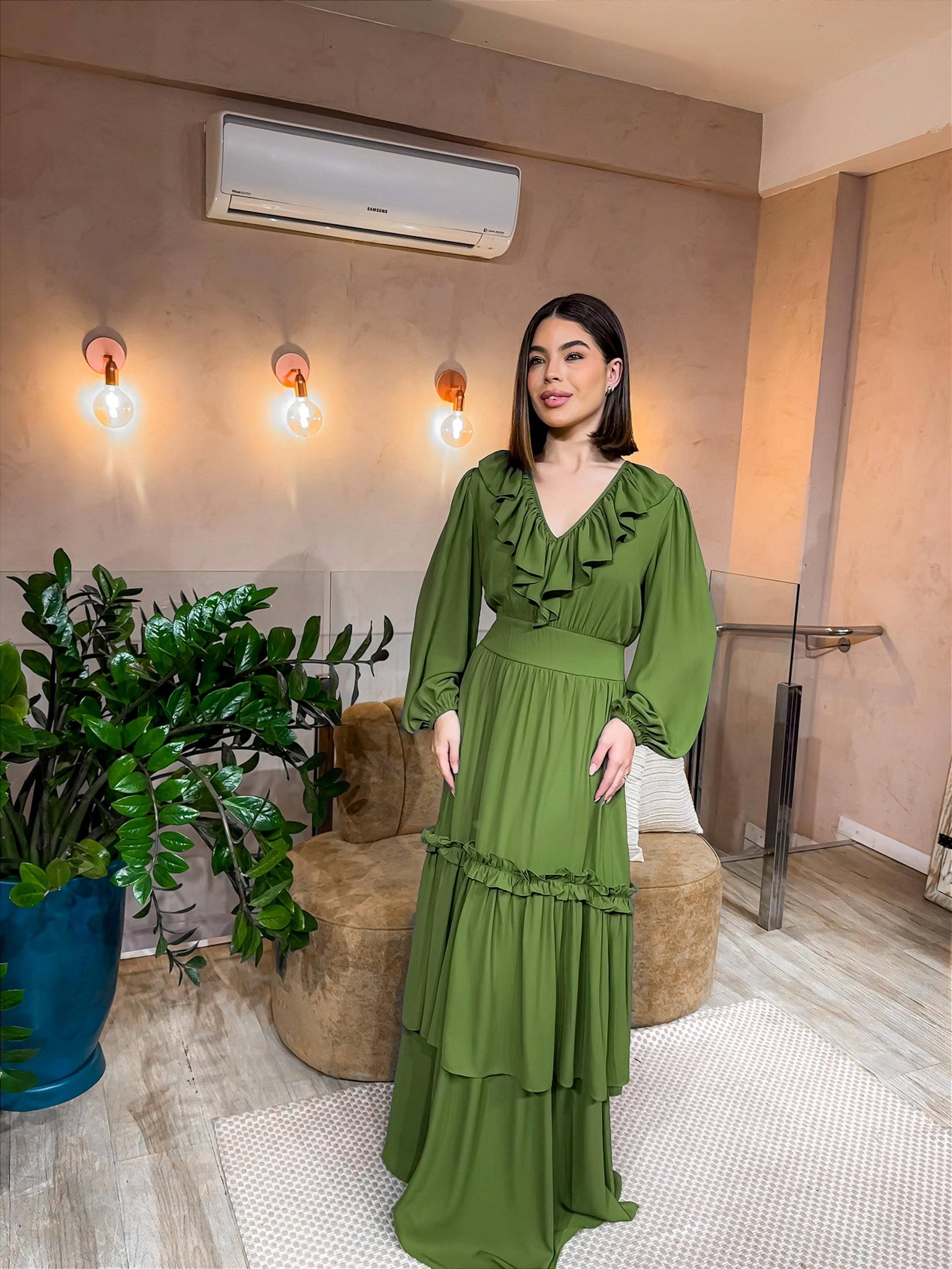 VESTIDO LONGO CHIFON M L COM BABADO VERDE OLIVA