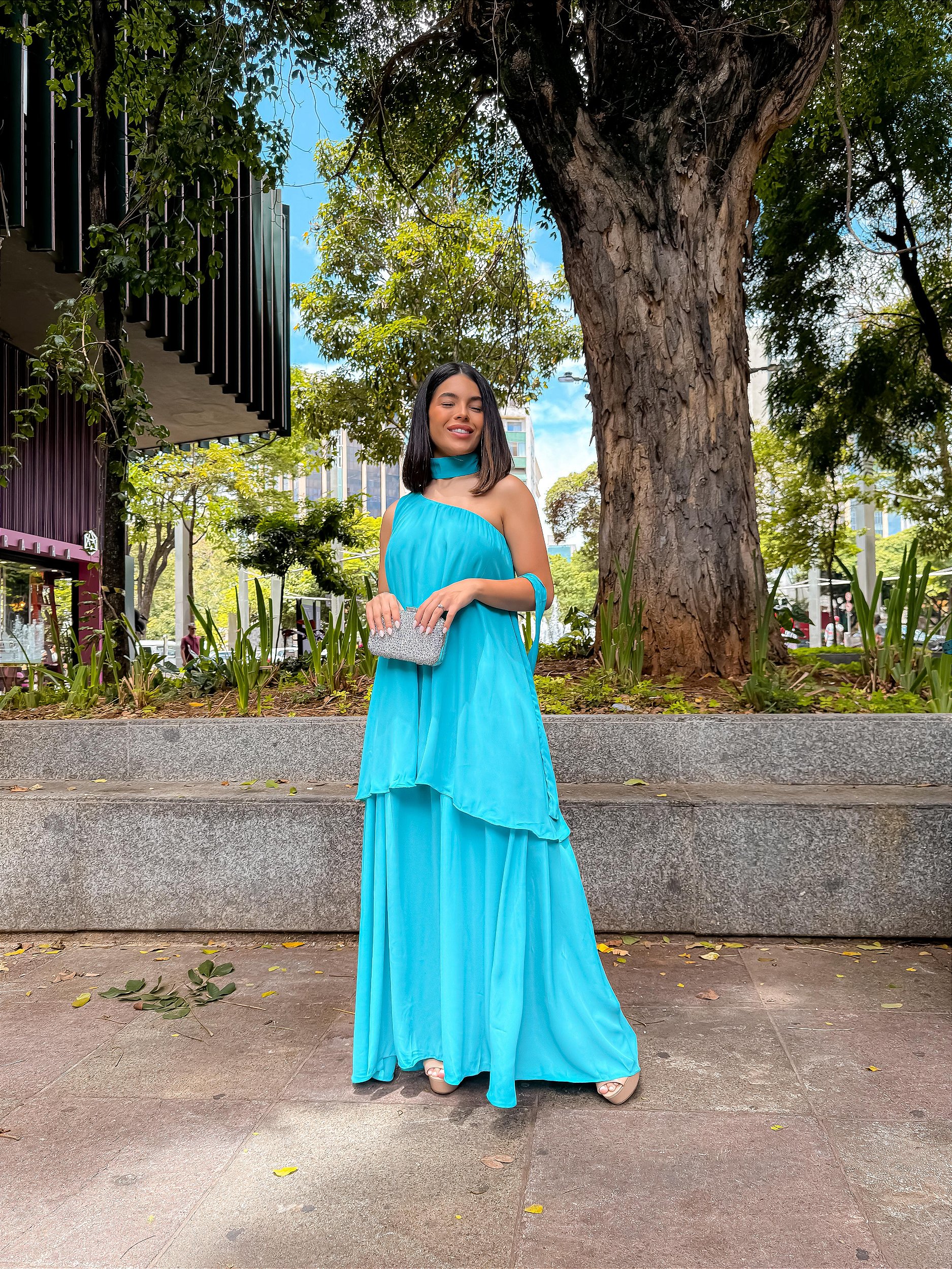 VESTIDO LONGO CHIFON UM OMBRO SÓ BARRA IRREGULAR EM CAMADA DETALHE NO PESCOÇO TURQUESA
