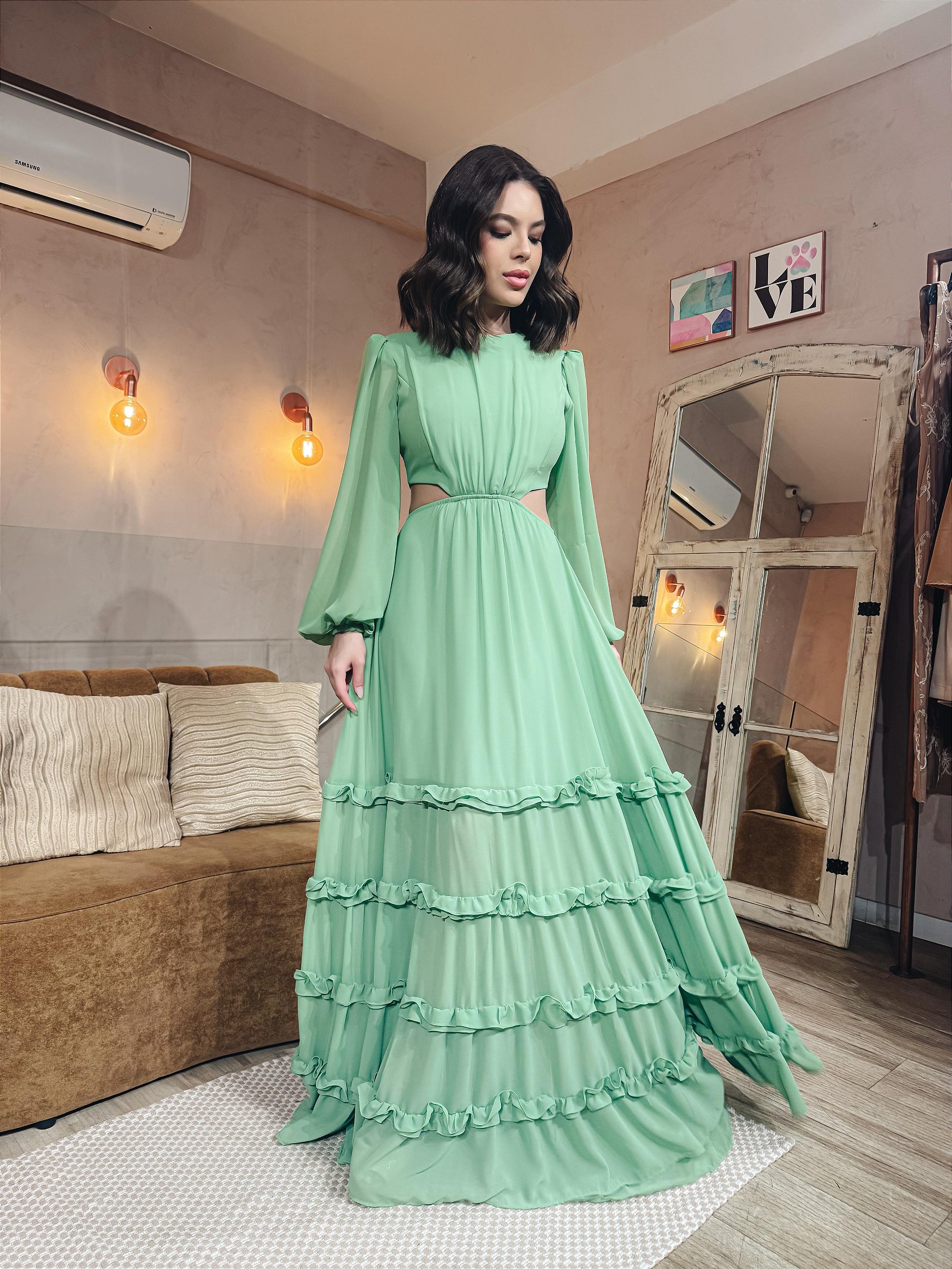 VESTIDO LONGO CREPE DE SEDA MANGA LONGO SAIA COM CAMADAS COSTAS VAZADA VERDE MENTA MB