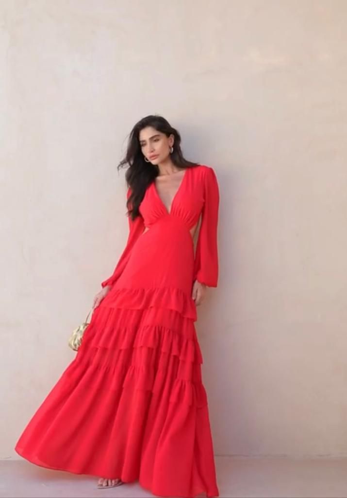 VESTIDO LONGO CREPE DE SEDA MANGA LONGA SAIA COM CAMADAS COSTAS VAZADA VERMELHO MB