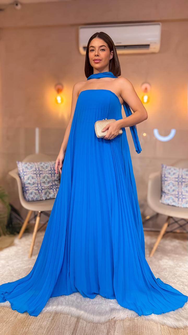 VESTIDO LONGO CREPE DE SEDA TOMARA QUE CAIA COM FAIXA NO PESCOÇO AZUL ROYAL