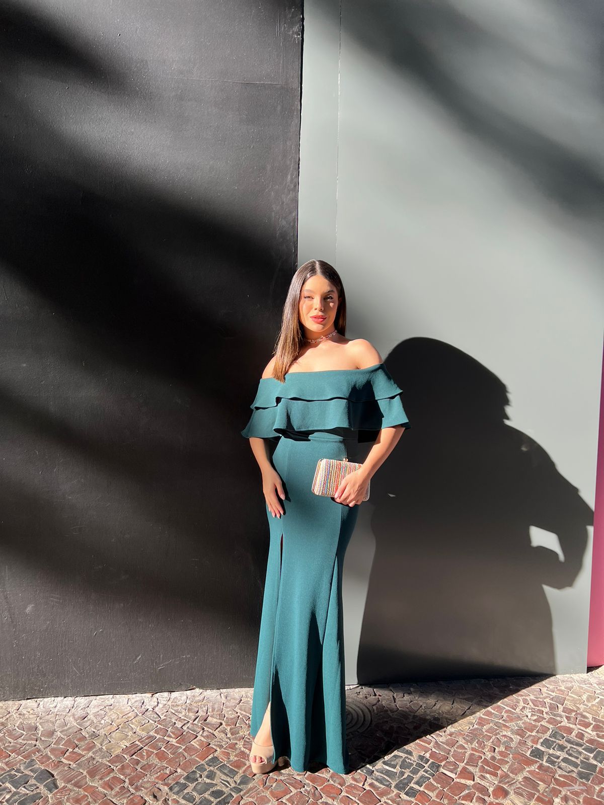 VESTIDO LONGO CREPE ESTILO SEREIA OMBRO A OMBRO VERDE ESMERALDA
