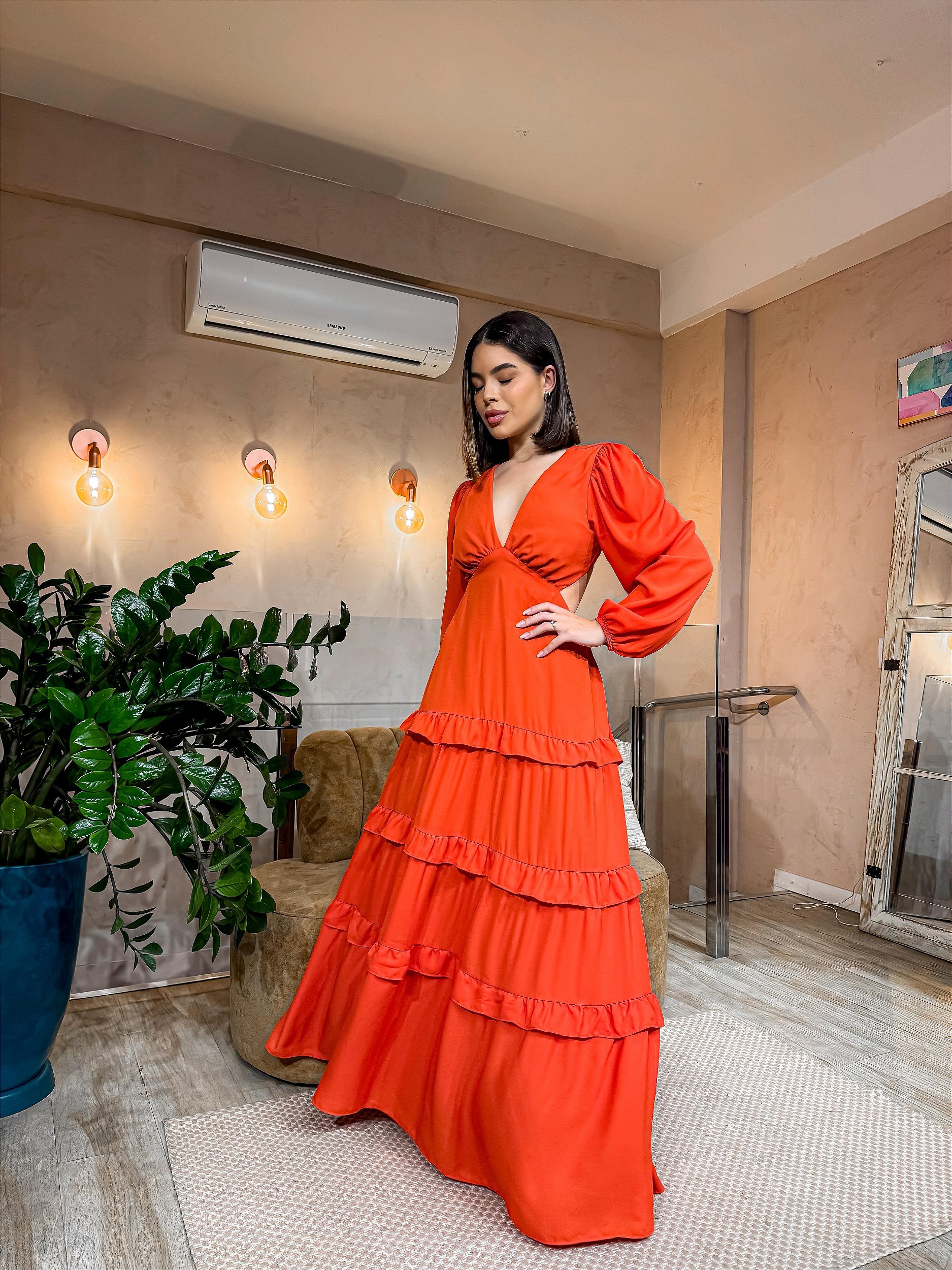 VESTIDO LONGO CREPE SAIA 3 MARIAS RECORTE CINTURA AMARRAÇÃO LARANJA
