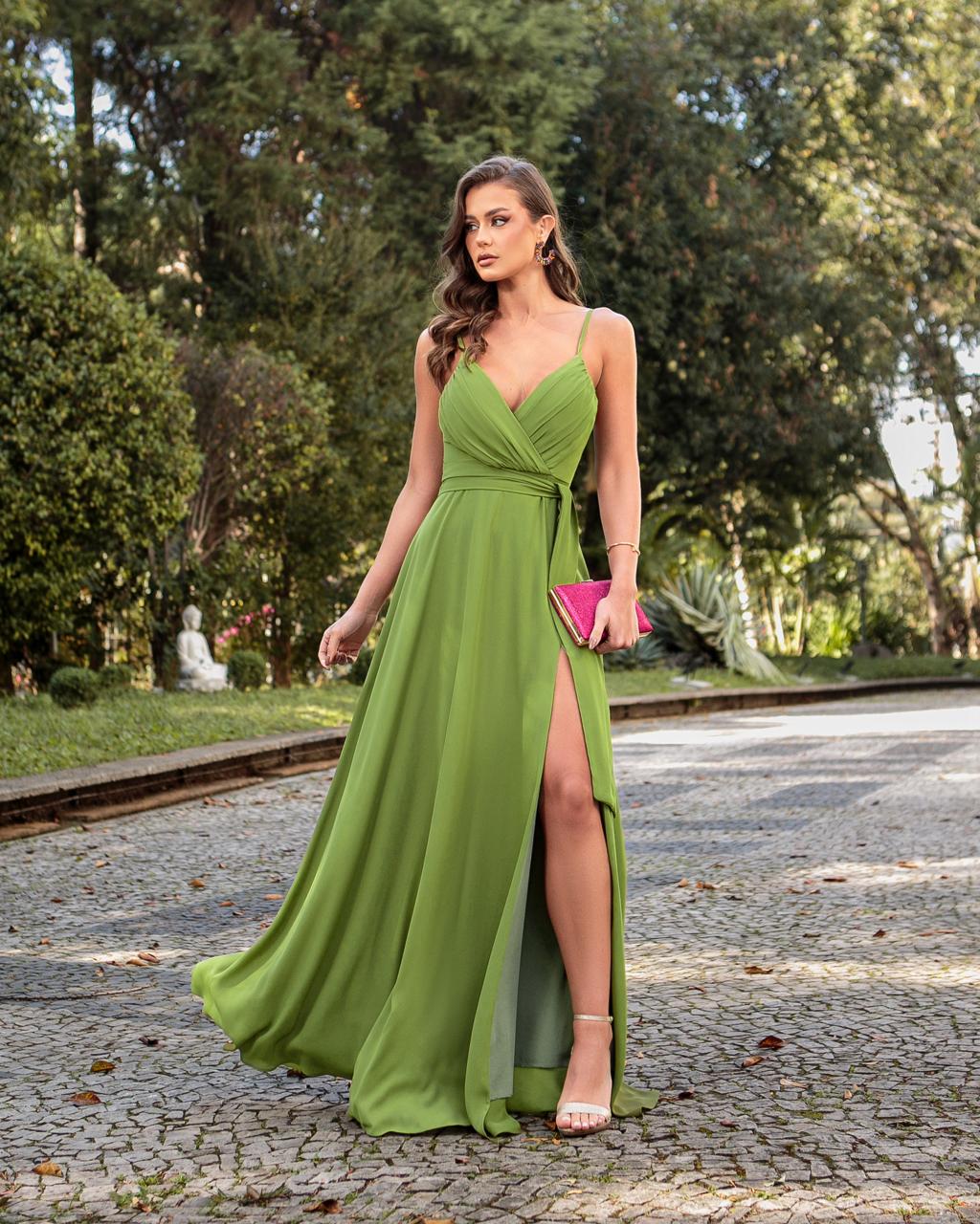 VESTIDO LONGO CREPE SEDA ALCINHA BUSTO DRAPEADO VERDE CLARO