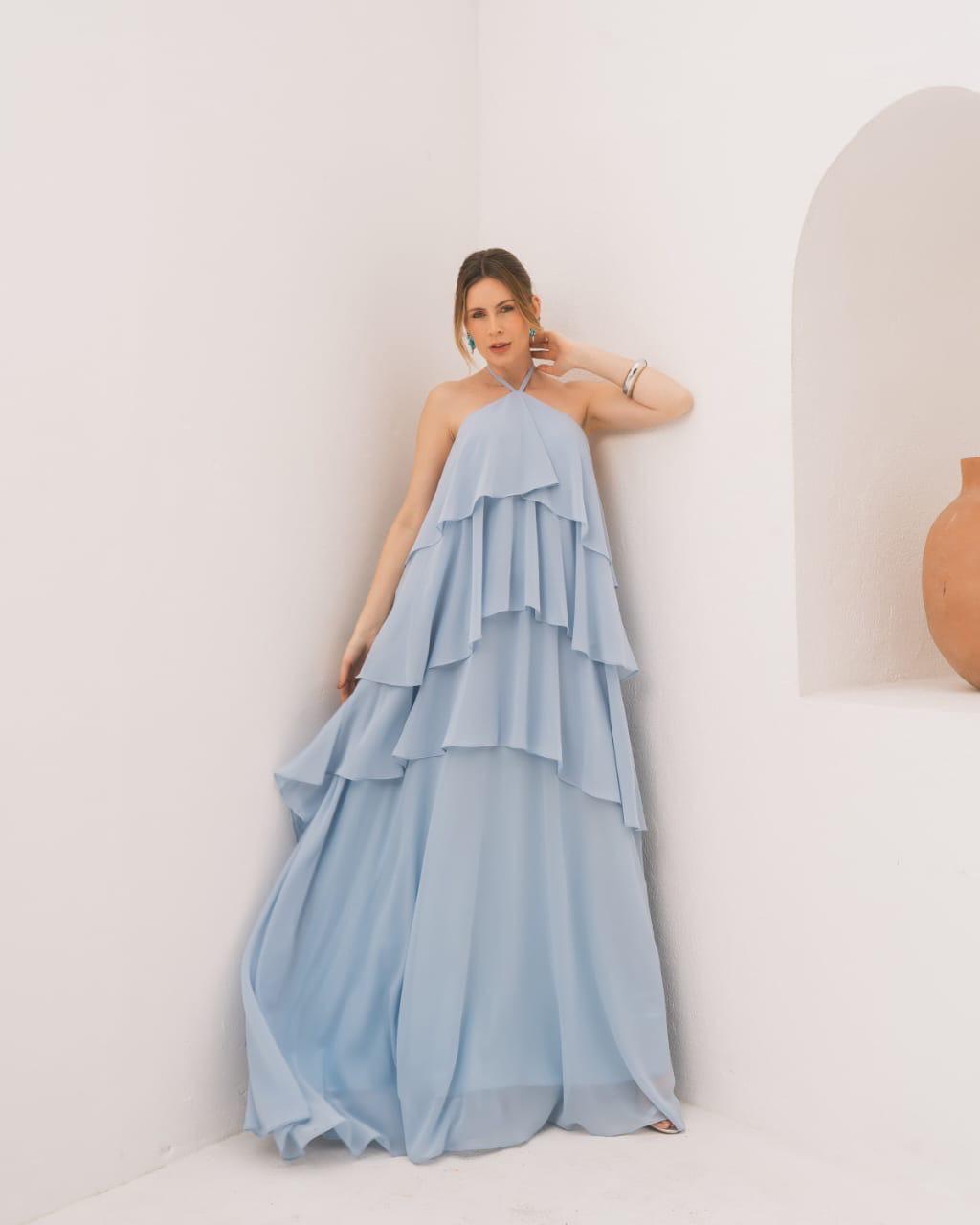 VESTIDO LONGO ALCINHA COM BABADOS TRÊS MARIAS DETALHE FLOR AZUL SERENITY