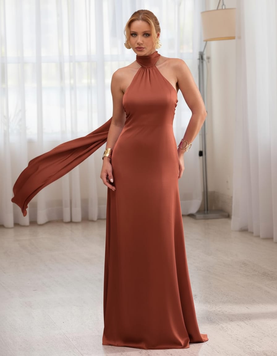 VESTIDO LONGO GOLA ALTA SEDA COM AMARRAÇÃO TERRACOTA