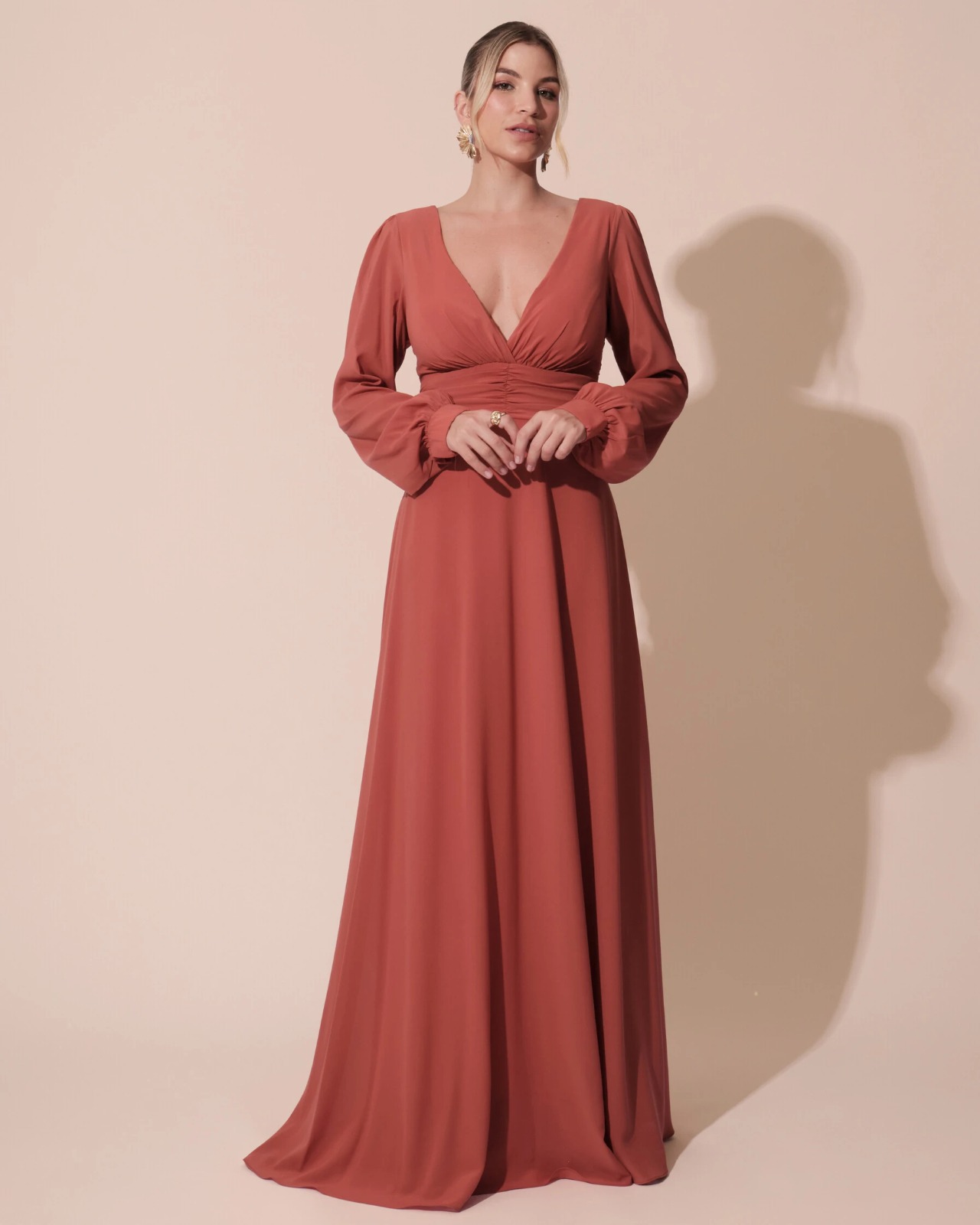 VESTIDO LONGO MANGA LONGA COM DETALHE DRAPEADO NA CINTURA DECOTE V TERRACOTA