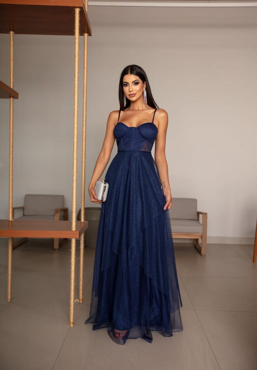 VESTIDO LONGO MICROTULE C/GLITTER ESTILO CORPET DETALHE TRANCINHA CINTURA AZUL MARINHO