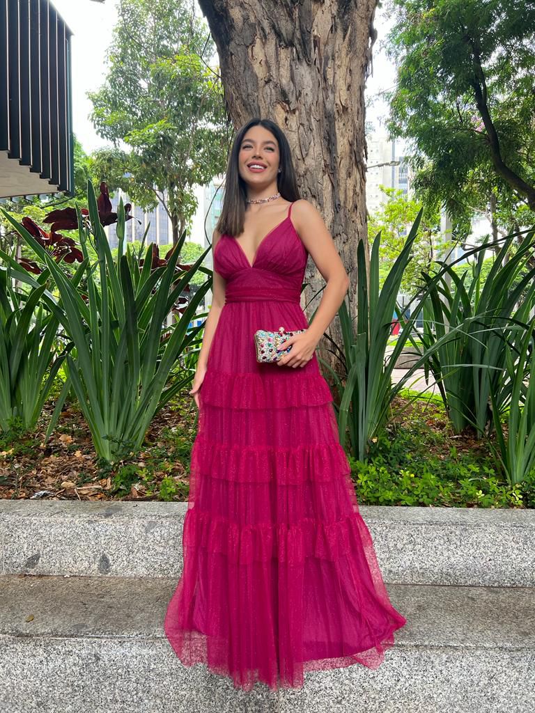 VESTIDO LONGO MICROTULE COM BRILHO BUSTO EM V DETALHE DRAPEADO ALCINHA SAIA BABADO PINK