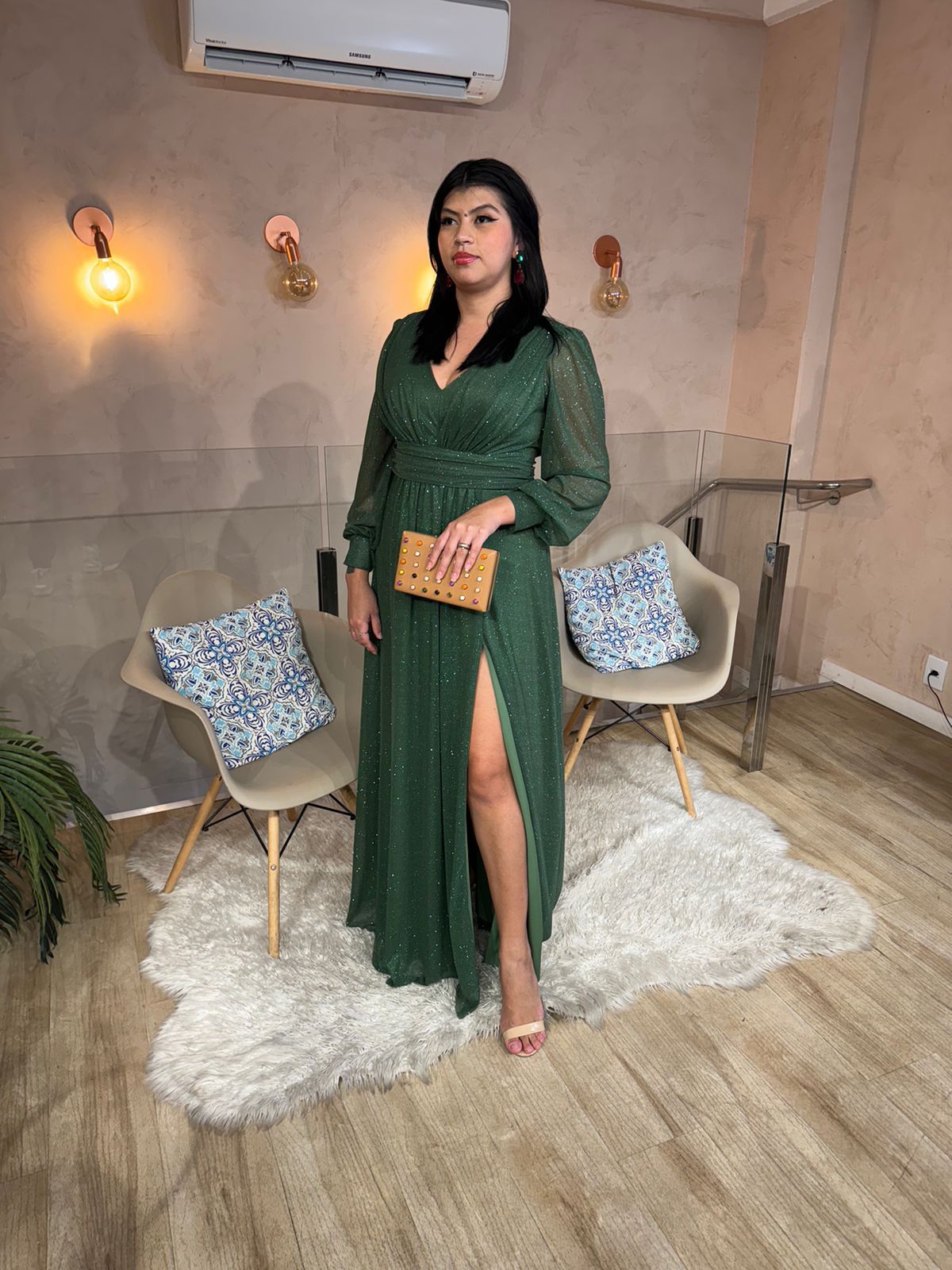 VESTIDO LONGO MICROTULE COM GLITTER MANGA LONGA BUSTO DRAPEADO PALA CINTURA VERDE ESMERALDA