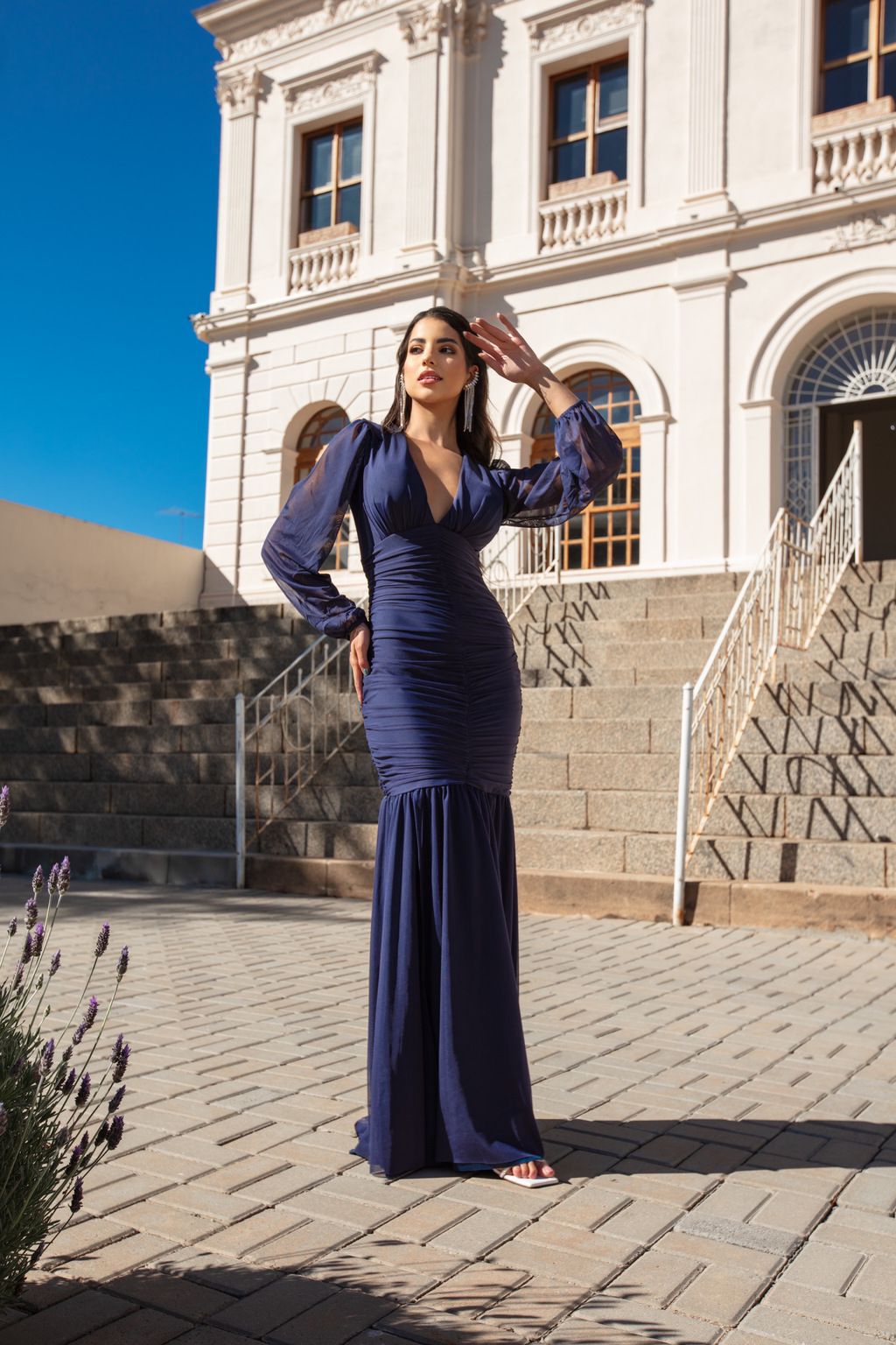 VESTIDO LONGO MICROTULE MANGA LONGA DRAPEADO SAIA ESTILO SEREIA AZUL MARINHO