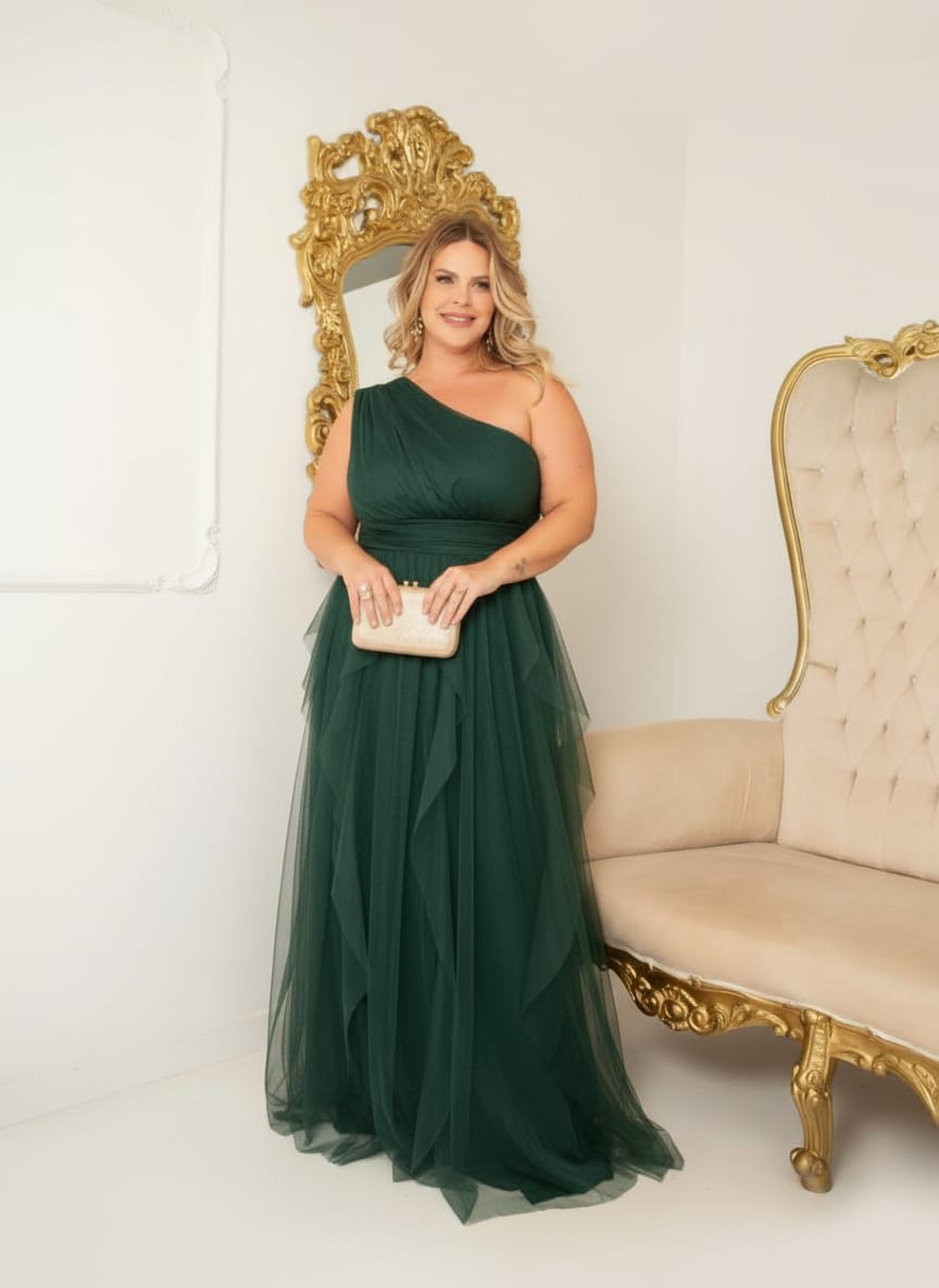 VESTIDO LONGO MICROTULE UM OMBRO SÓ PALA CINTURA SAIA EM CAMADAS VERTICAIS VERDE PETROLÉO