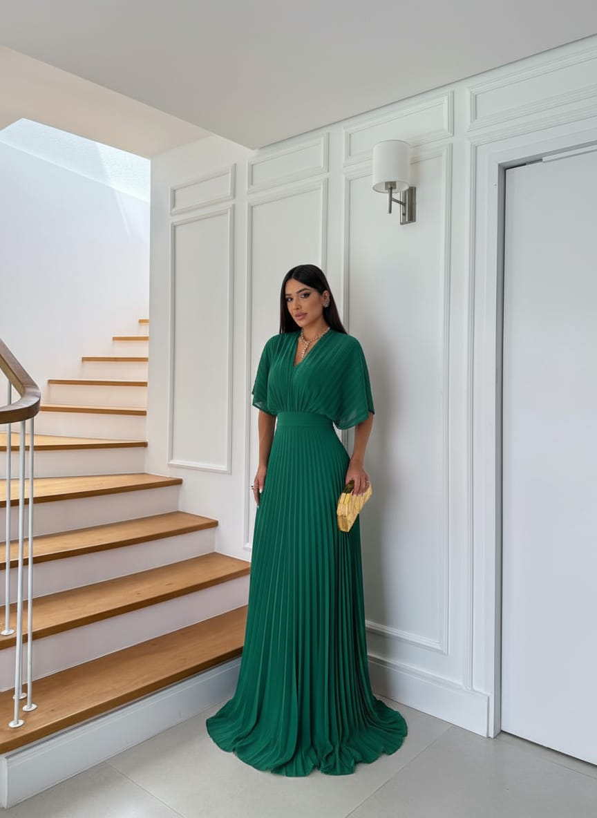 VESTIDO LONGO PLISSADO COM MANGA PLUSADA VERDE ESMERALDA