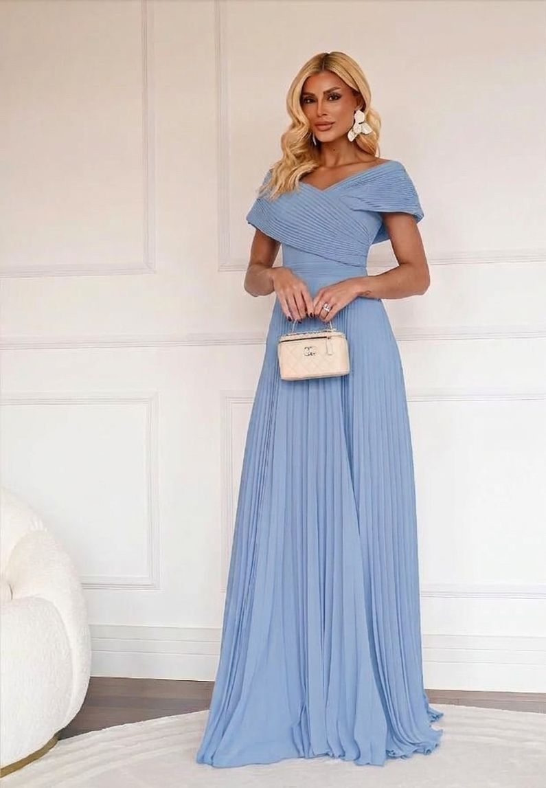 VESTIDO LONGO PLISSADO DECOTE ASSIMÉTRICO COM CINTURA MARCADA AZUL SERENITY