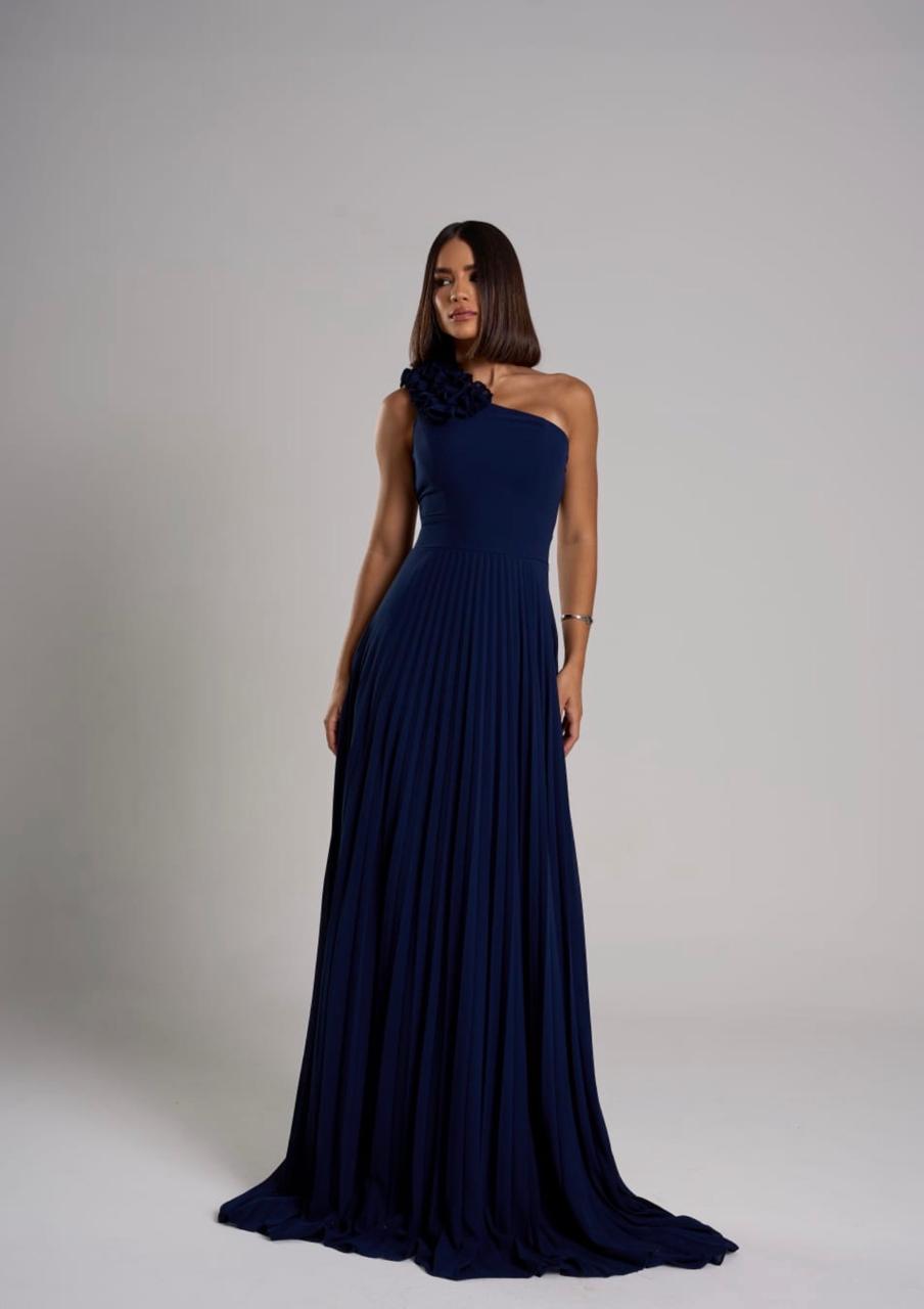VESTIDO LONGO PLISSADO UM OMBRO SÓ APLICAÇÃO FLORAL EM RELEVO AZUL MARINHO