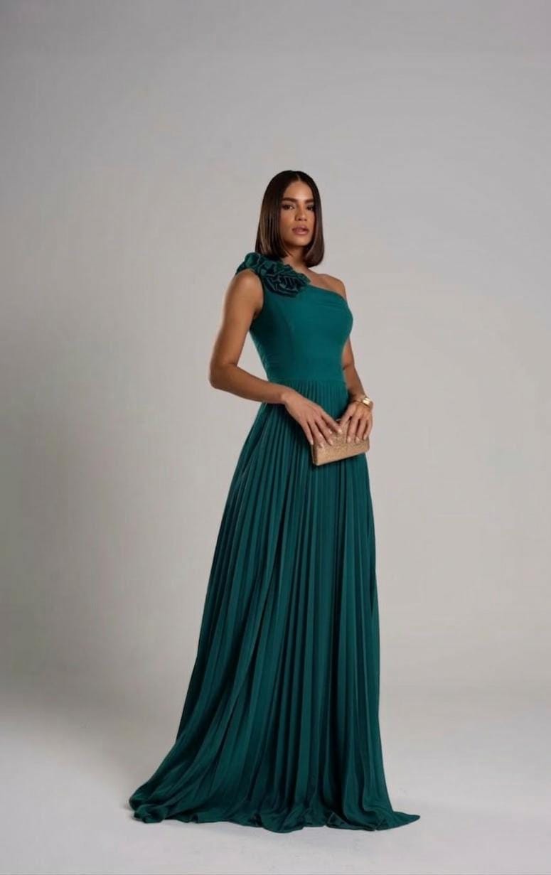 VESTIDO LONGO PLISSADO UM OMBRO SÓ APLICAÇÃO FLORAL EM RELEVO VERDE PETRÓLEO