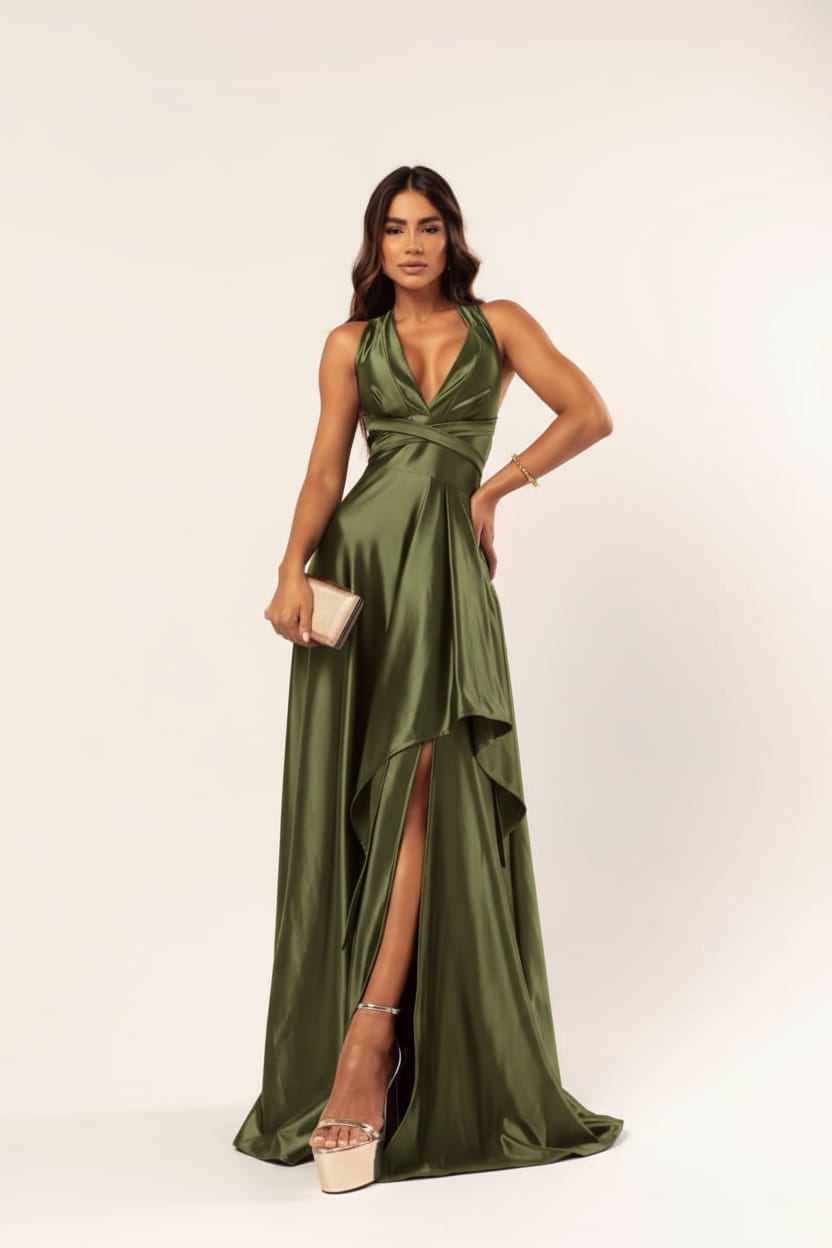 VESTIDO LONGO PRADA COM ELASTANO FRENTE UNICA FENDA LATERAL VERDE OLIVA