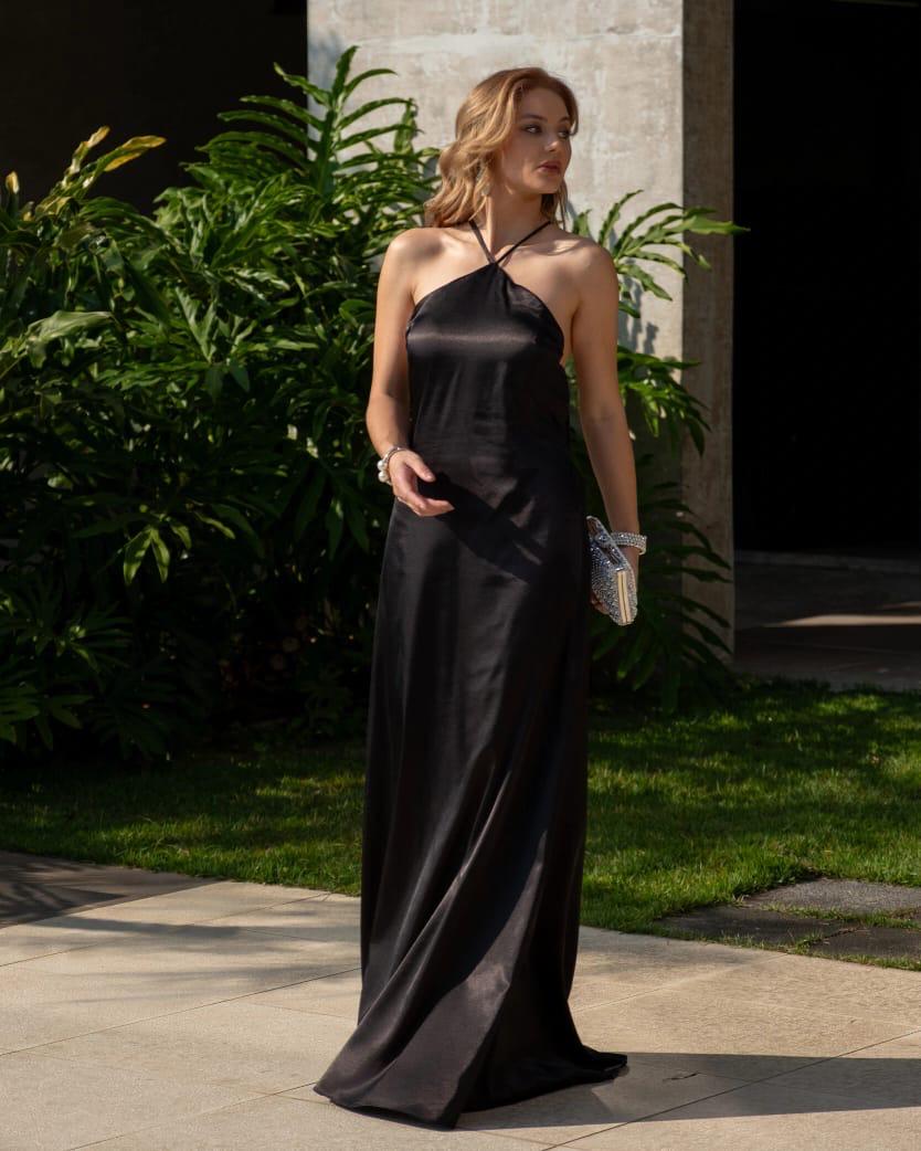 VESTIDO LONGO SEDA DECOTE BAIXO COSTAS PRETO VILMA