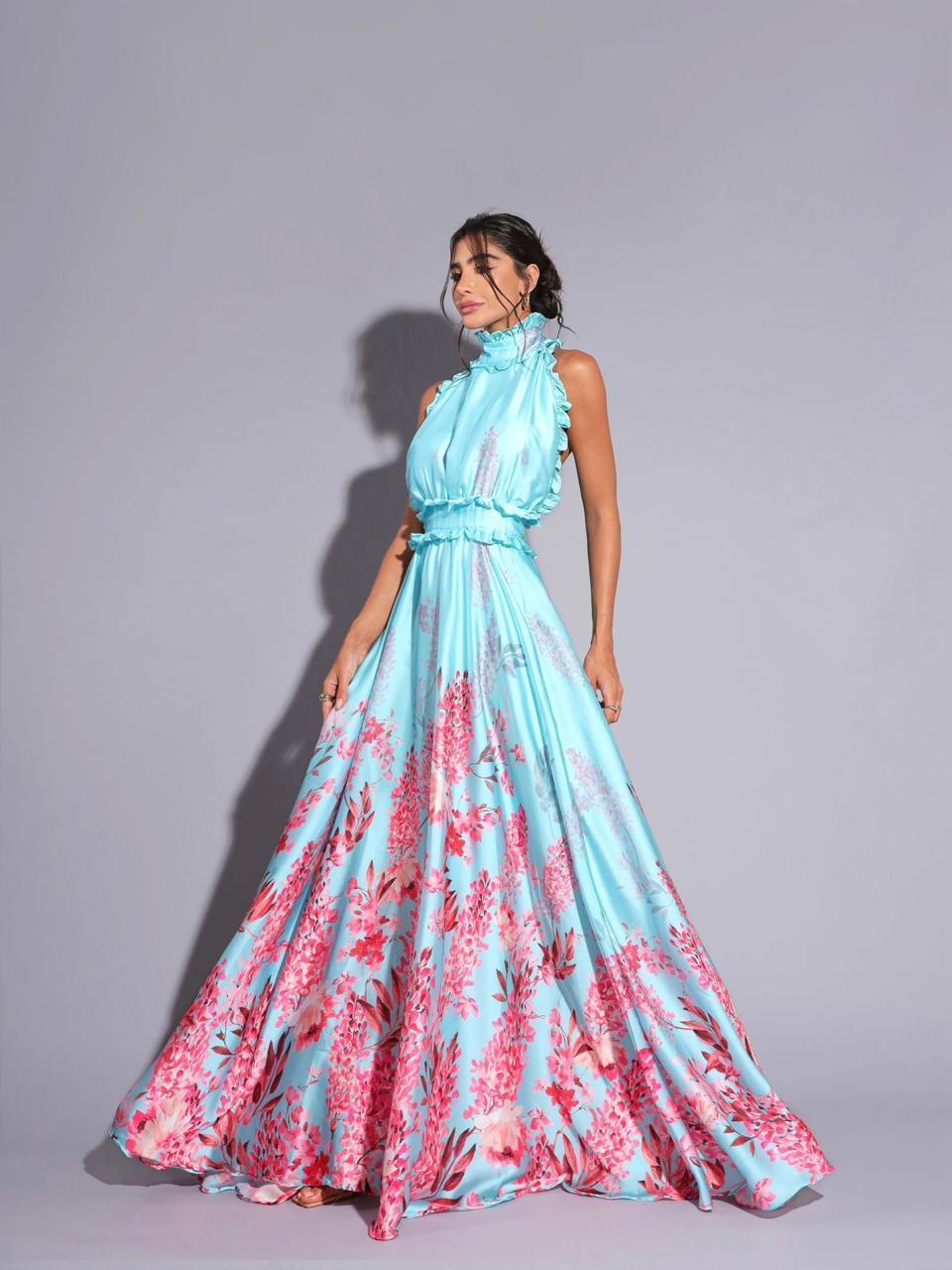 VESTIDO LONGO SEDA FRENTE UNICA GOLA E CINTURA BABADO AZUL FLORAL MB