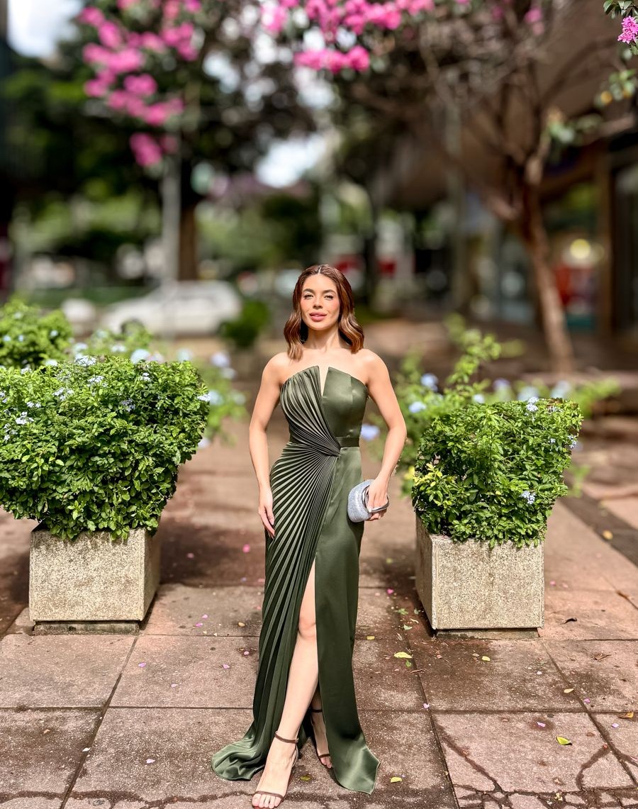 VESTIDO LONGO SEDA TOMARA QUE CAIA METADE PLISSADO METADE LISO FENDA FRENTE VERDE OLIVA