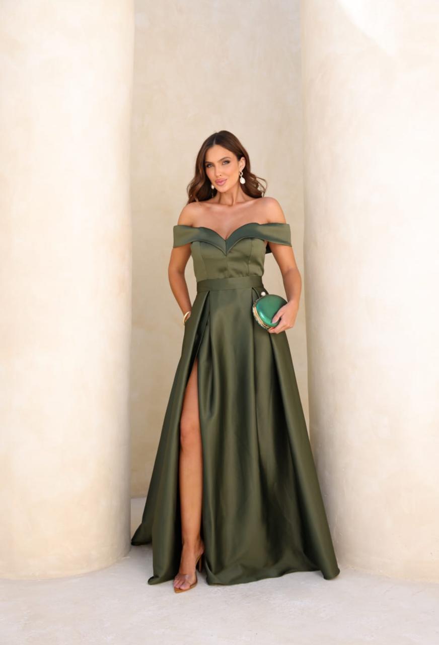VESTIDO LONGO ZIBELINE OMBRO A OMBRO ACINTURADO DECOTE CORAÇÃO VERDE OLIVA