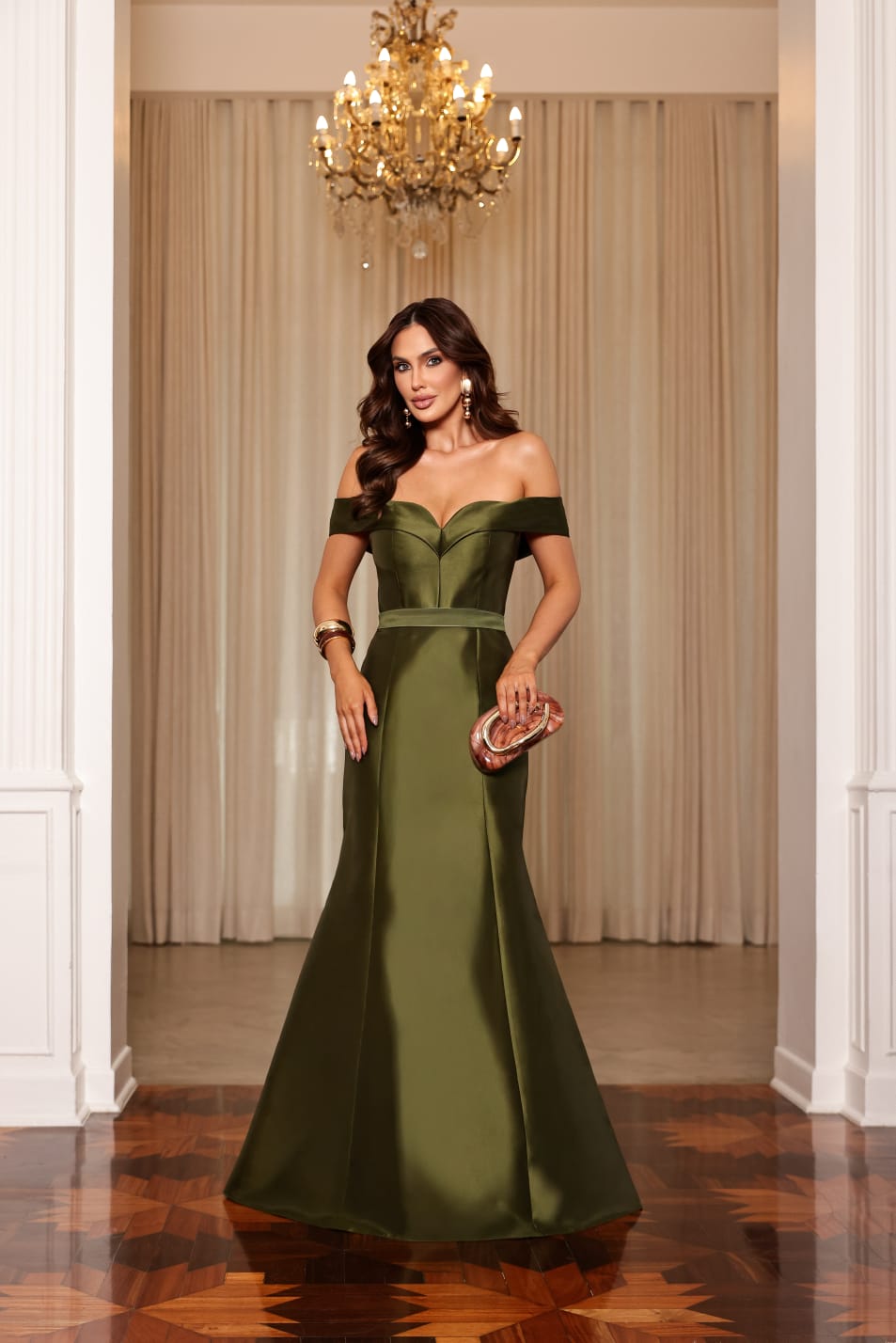 VESTIDO LONGO ZIBELINE OMBRO A OMBRO ACINTURADO DECOTE CORAÇÃO VERDE OLIVA
