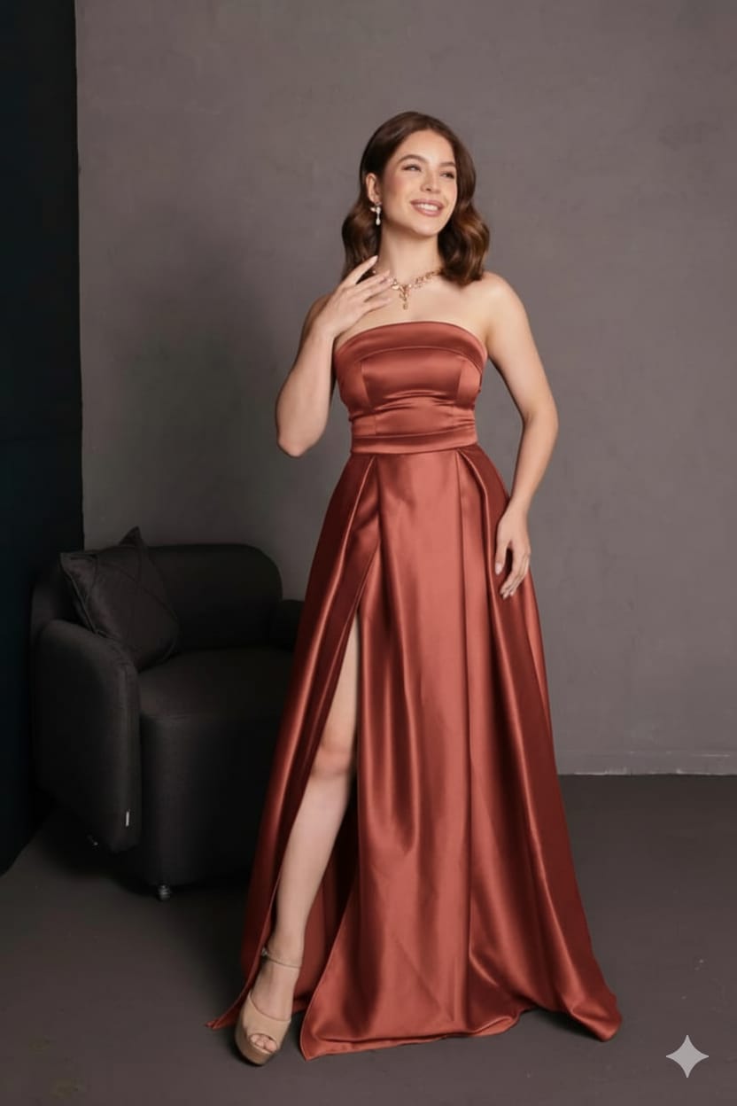 VESTIDO LONGO ZIBELINE TOMARA QUE CAIA FAIXA ACINTURADA E FENDA TERRA COTA