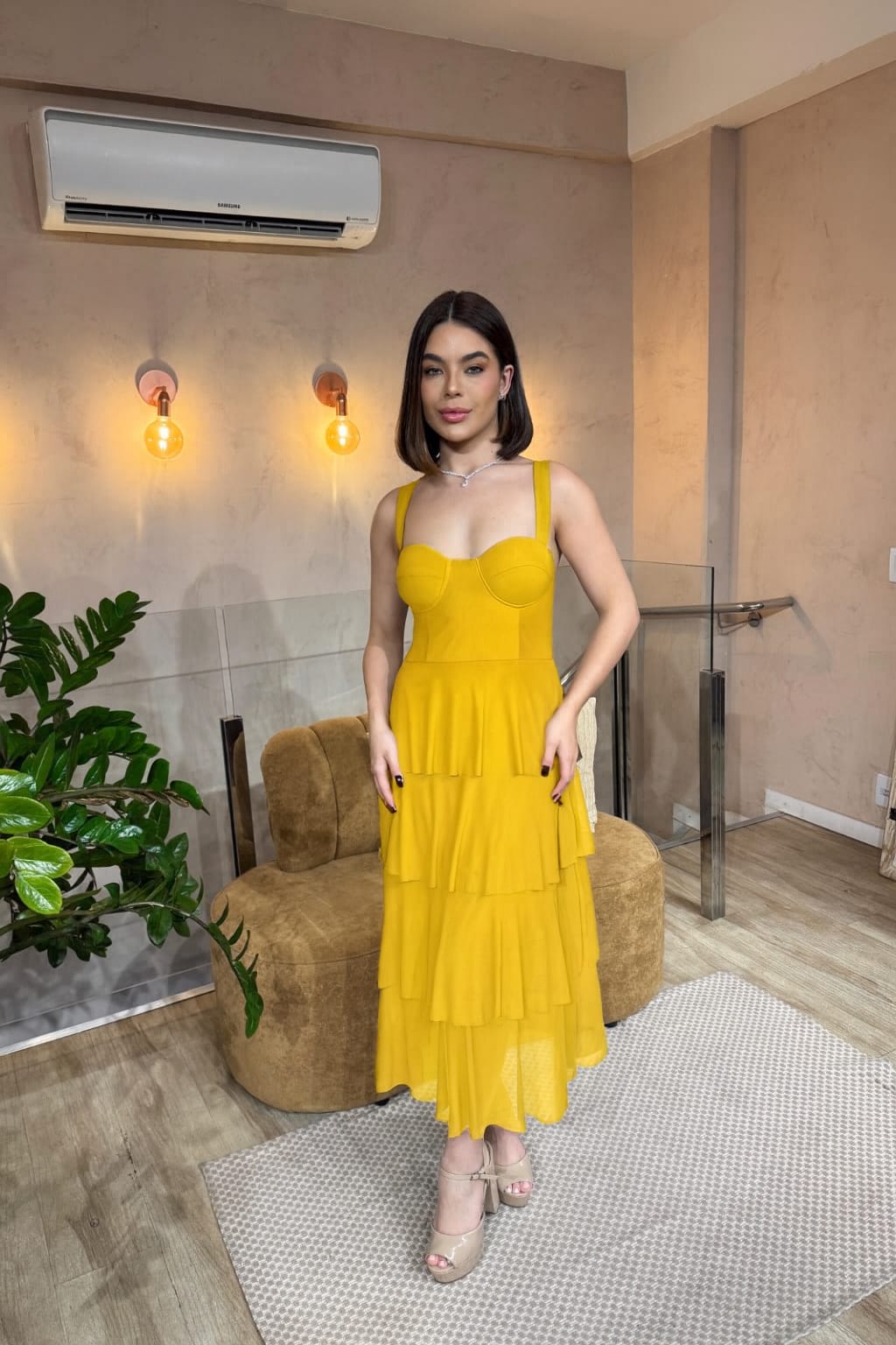 VESTIDO MIDI MICROTULLE ALÇA LARGA 3 MARIAS AMARELO