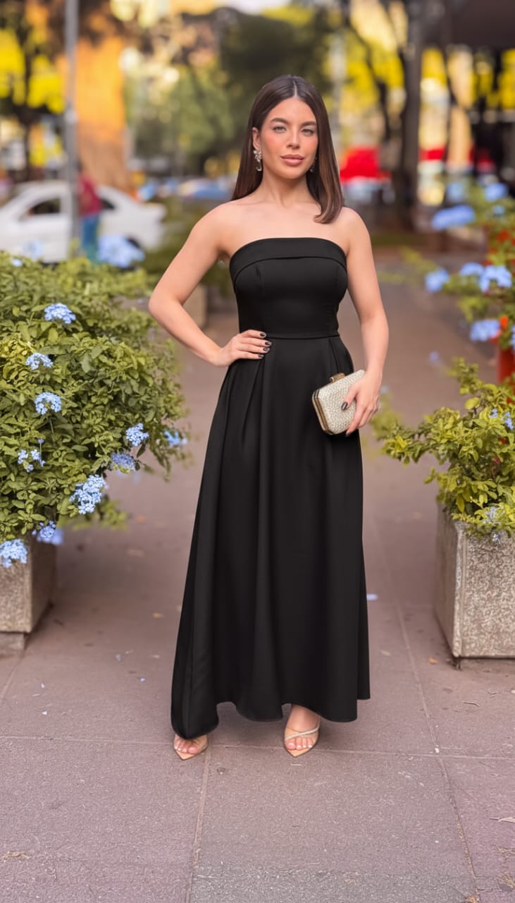VESTIDO MIDI TOMARA QUE CAIA CINTURA MARCADA PRETO
