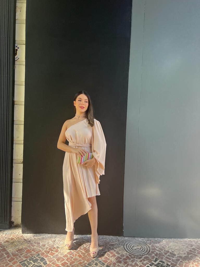 VESTIDO NEW MIDI UM OMBRO SÓ COM MANGA BARRA IRREGULAR NUDE