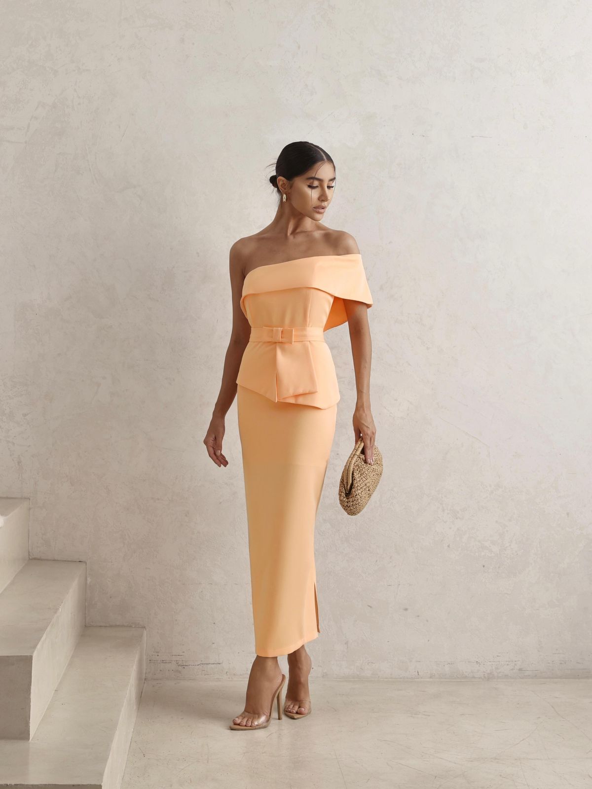 VESTIDO OMBRO SÓ DETALHE PEPLUM NA CINTURA COM CINTO CORAL