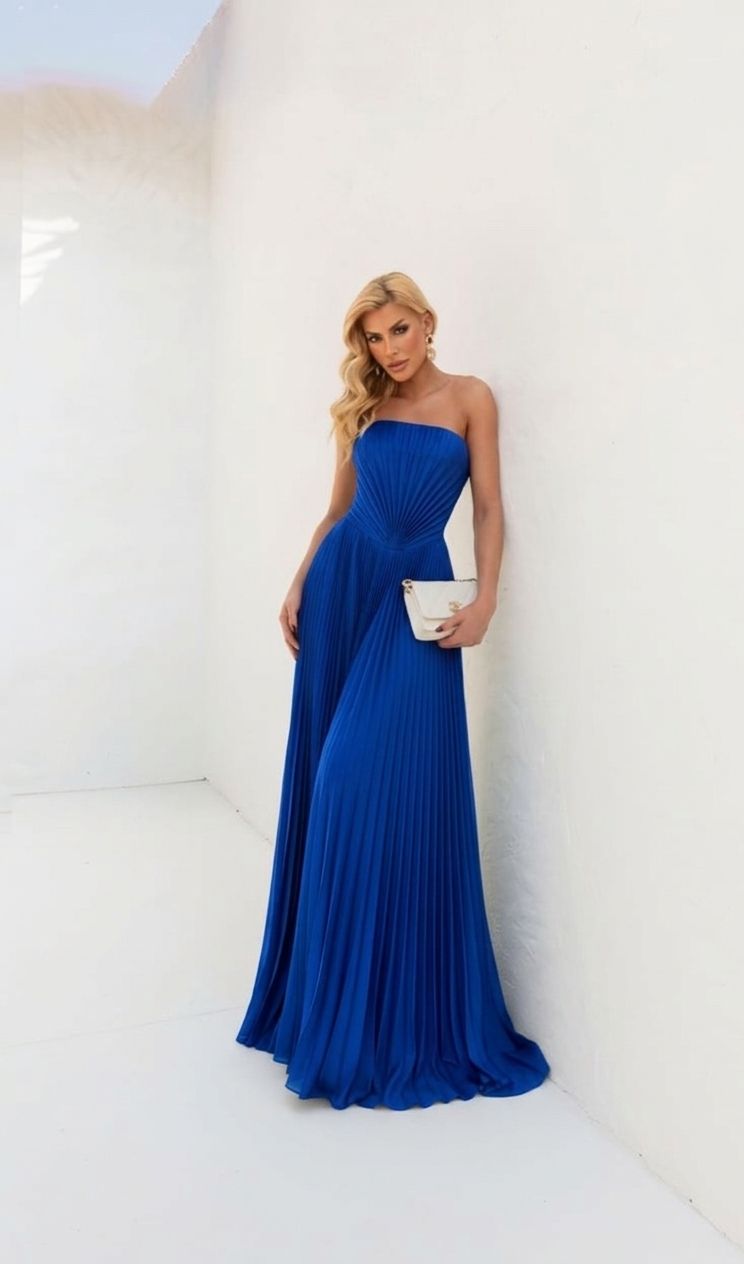 VESTIDO PLISSADO TOMARA QUE CAIA DETALHE V NA CINTURA AZUL ROYAL