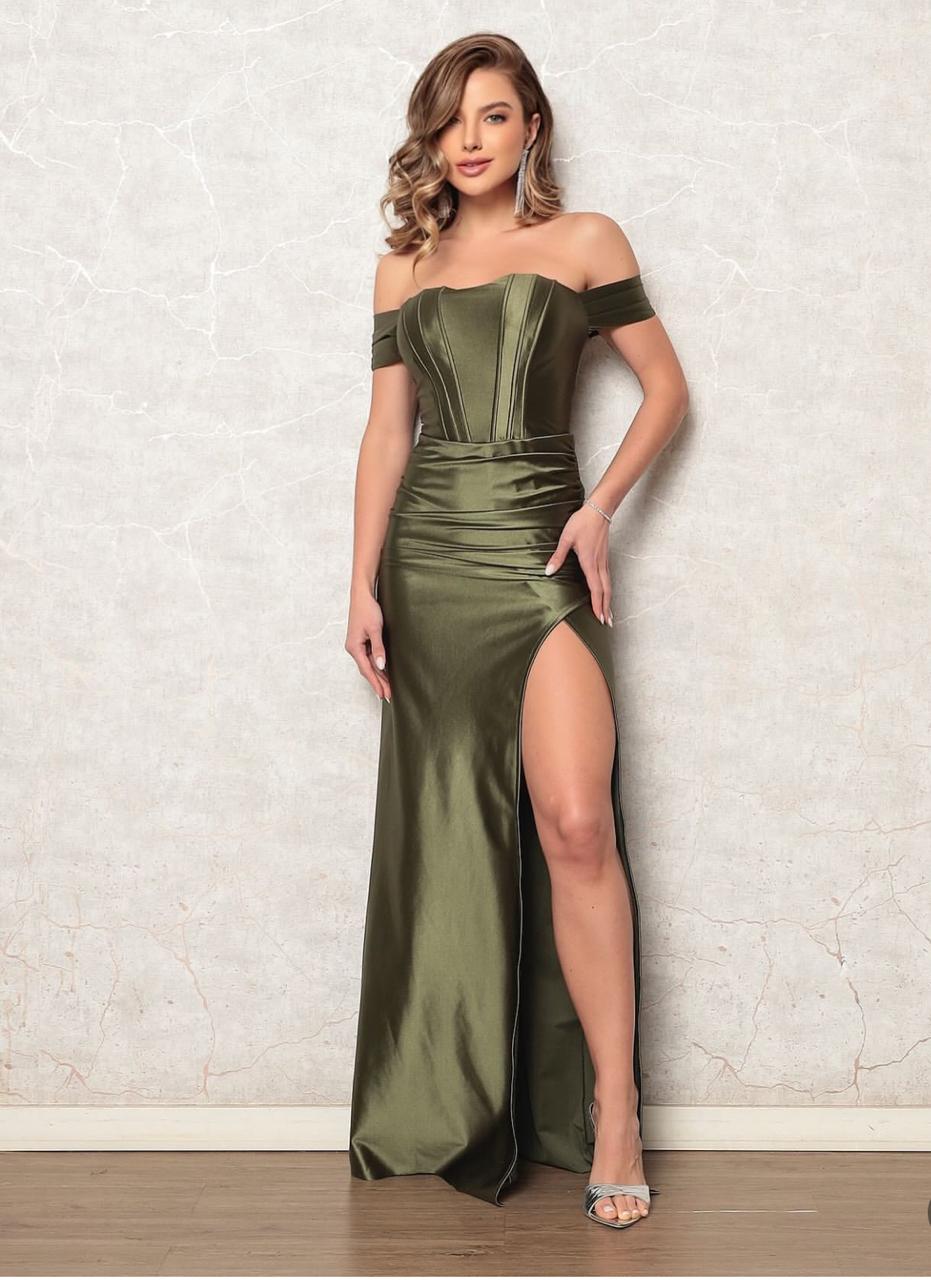 VESTIDO PRADA TOMARA QUE CAIA COM MANGUINHA E AMARRAÇÃO ATRAS VERDE OLIVA