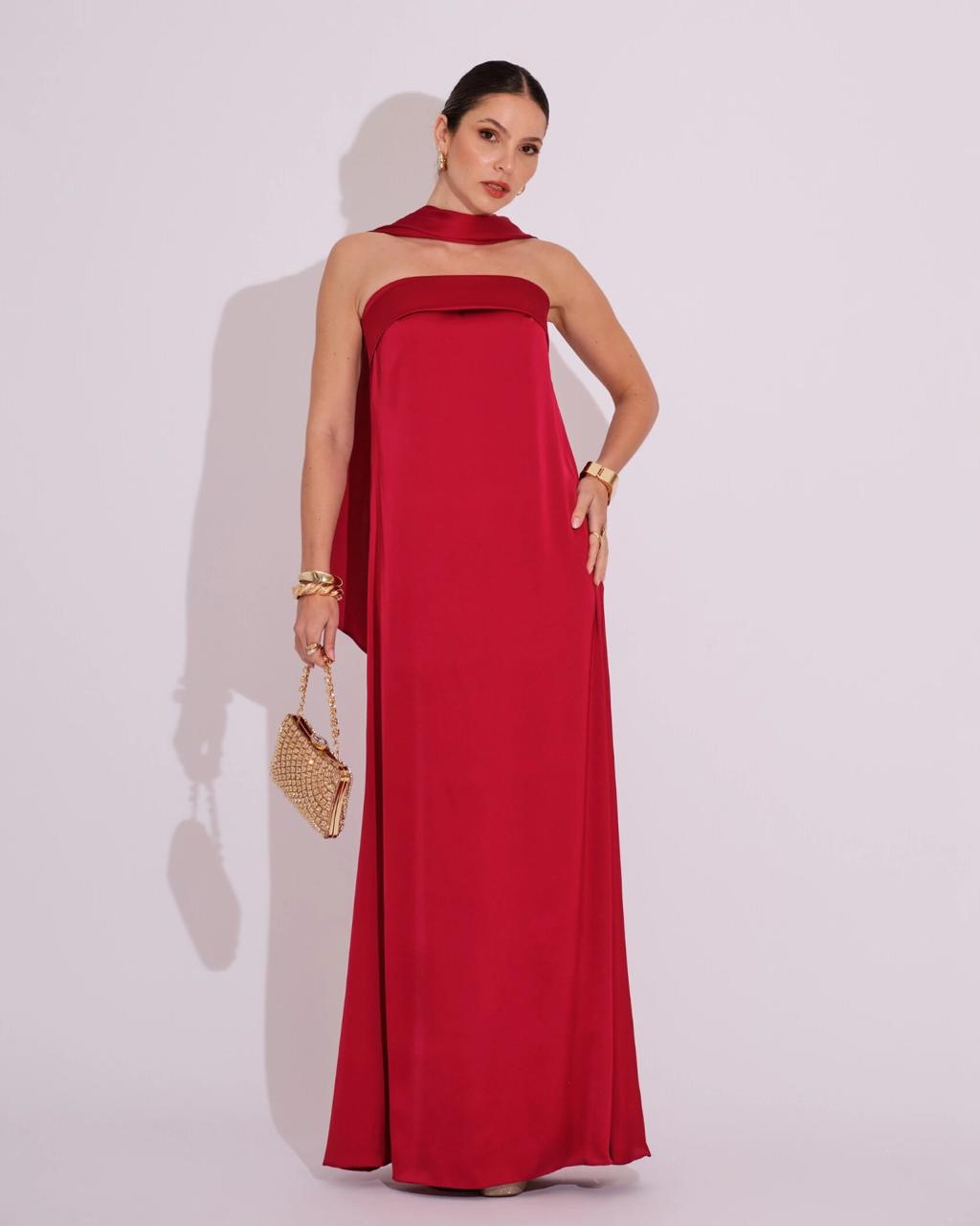 VESTIDO SEDA TOMARA QUE CAIA COM ECHARPE MARSALA
