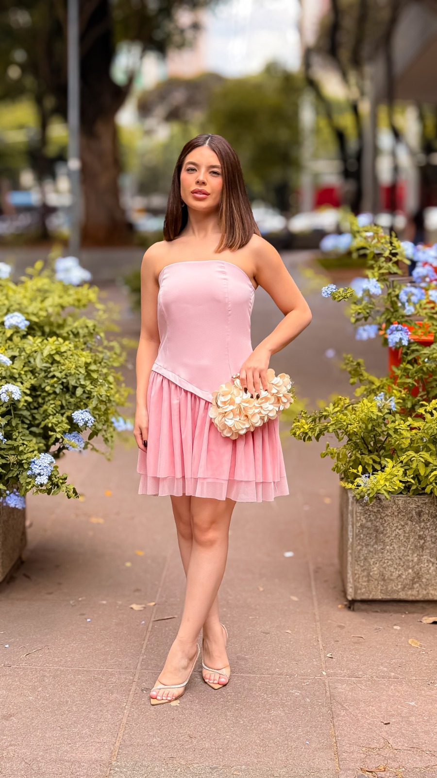 VESTIDO TOMARA QUE CAIA CREPE COM SAIA DE TULE ROSE
