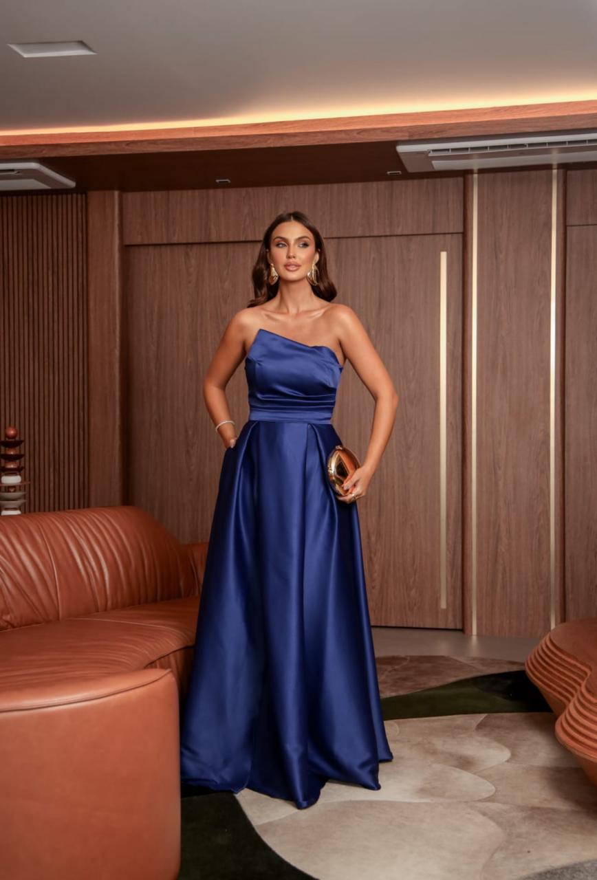 VESTIDO ZIBELINE LONGO TOMARA QUE CAIA COM DETALHE DRAPEADO ABAIXO DO BUSTO COM FENDA AZUL MARINHO