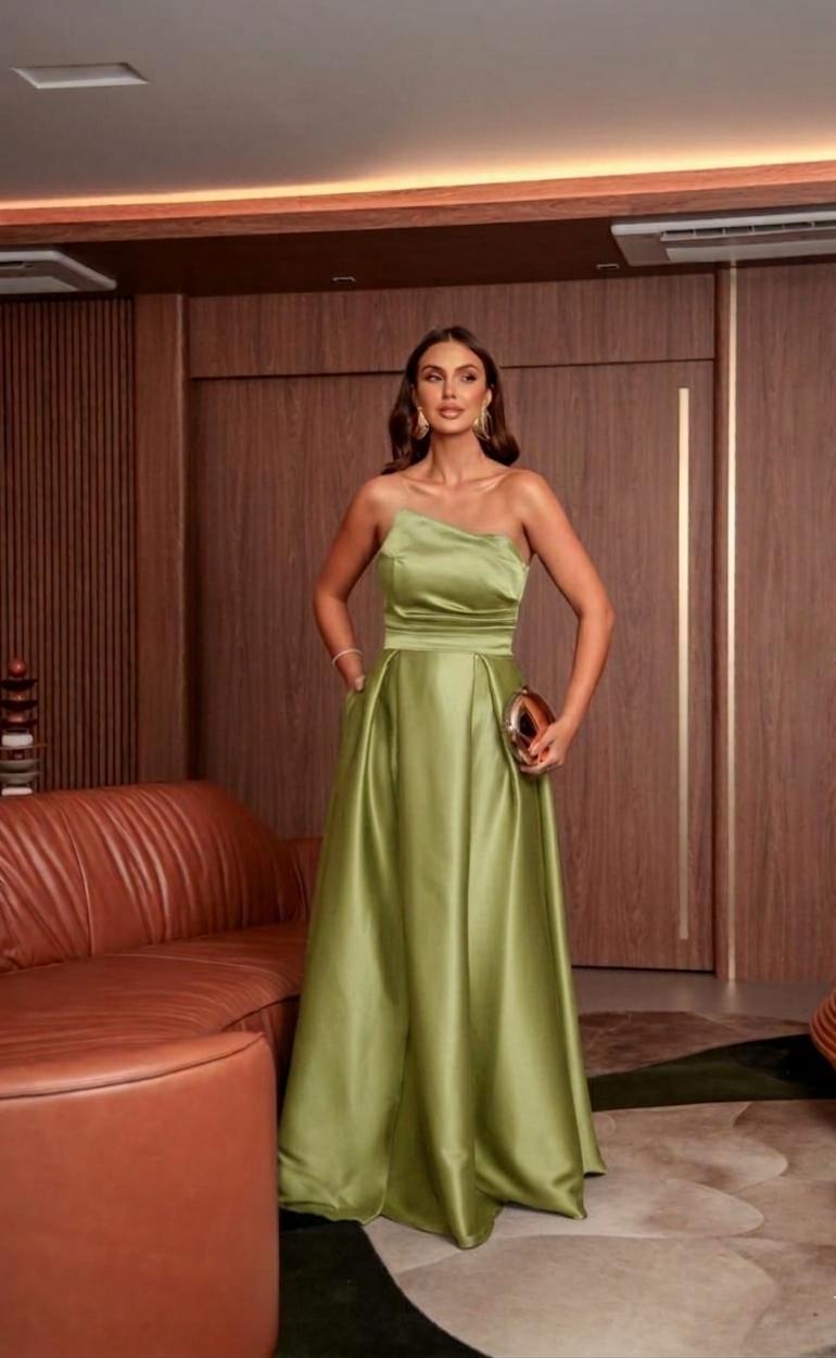 VESTIDO ZIBELINE LONGO TOMARA QUE CAIA COM DETALHE DRAPEADO ABAIXO DO BUSTO COM FENDA VERDE OLIVA